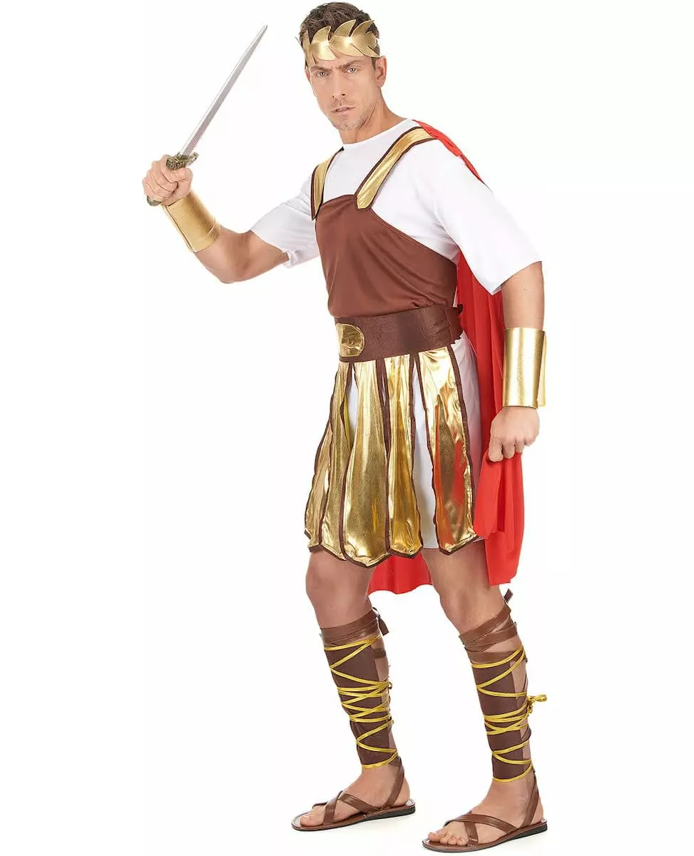 Covered in gilding! This Roman costume for men consists of 7 elements. (sword and sandals not included) A white tunic with a red cape and gold straps. A fake chest plate in brown fabric is sewn to the front. A centurion skirt to tie in the back. 2 golden bracelets in soft foam to velcro around your forearms. An elastic crown evoking golden and shiny laurels. And 2 brown felt leggings that will hold thanks to two gold ribbons to intertwine. This Roman costume will undoubtedly be the most historical of your costume parties! It's up to you to rewrite history! Accessories included: Tunic with Cape and False Breastplate Skirt 2 Bracelets Crown 2 Leg warmers Material: 100% Polyester Care: By hand