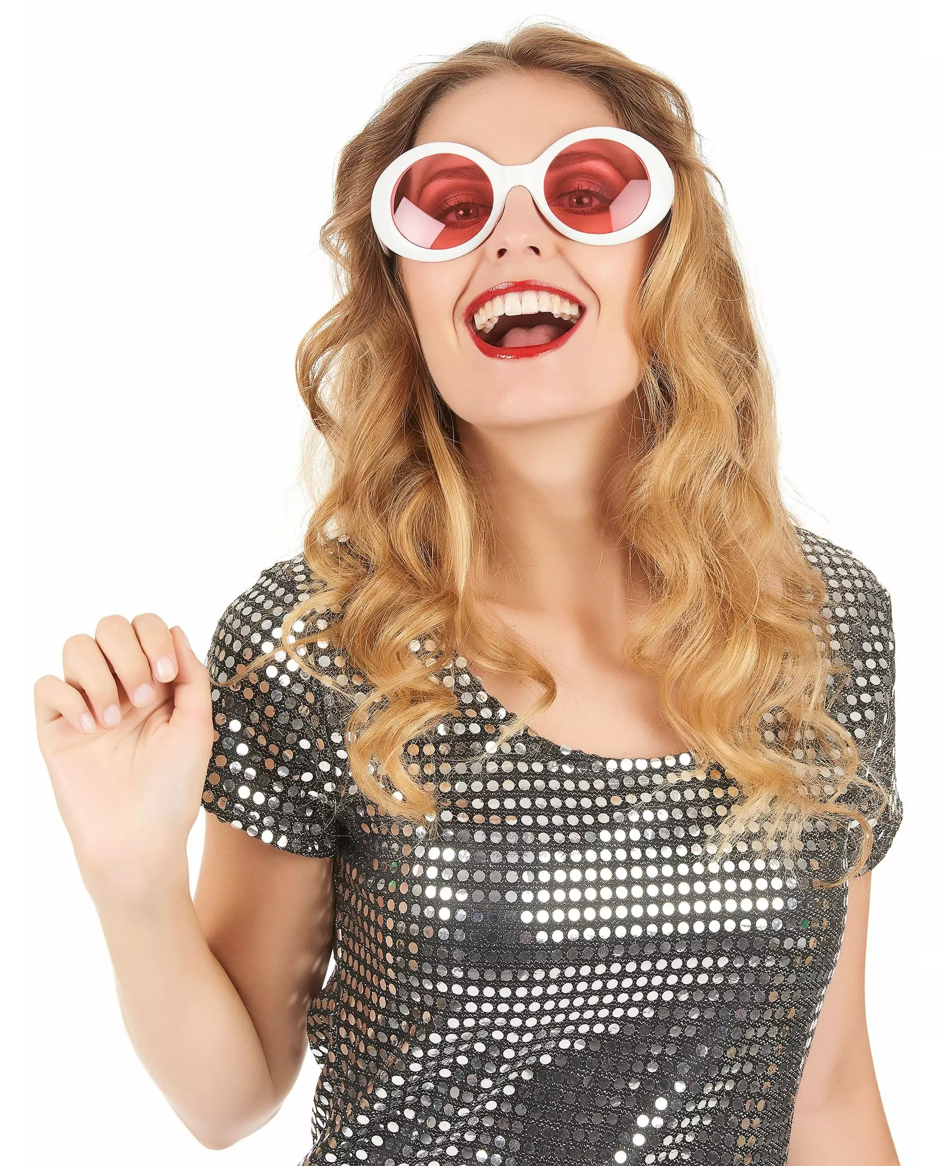 Retro! These round glasses are for adults. The frame is made of thick white plastic and the lenses are tinted red. To complete your 60s/70s or hippie themed costume, these glasses will be ideal!. Accessories included: Glasses Material: Plastic