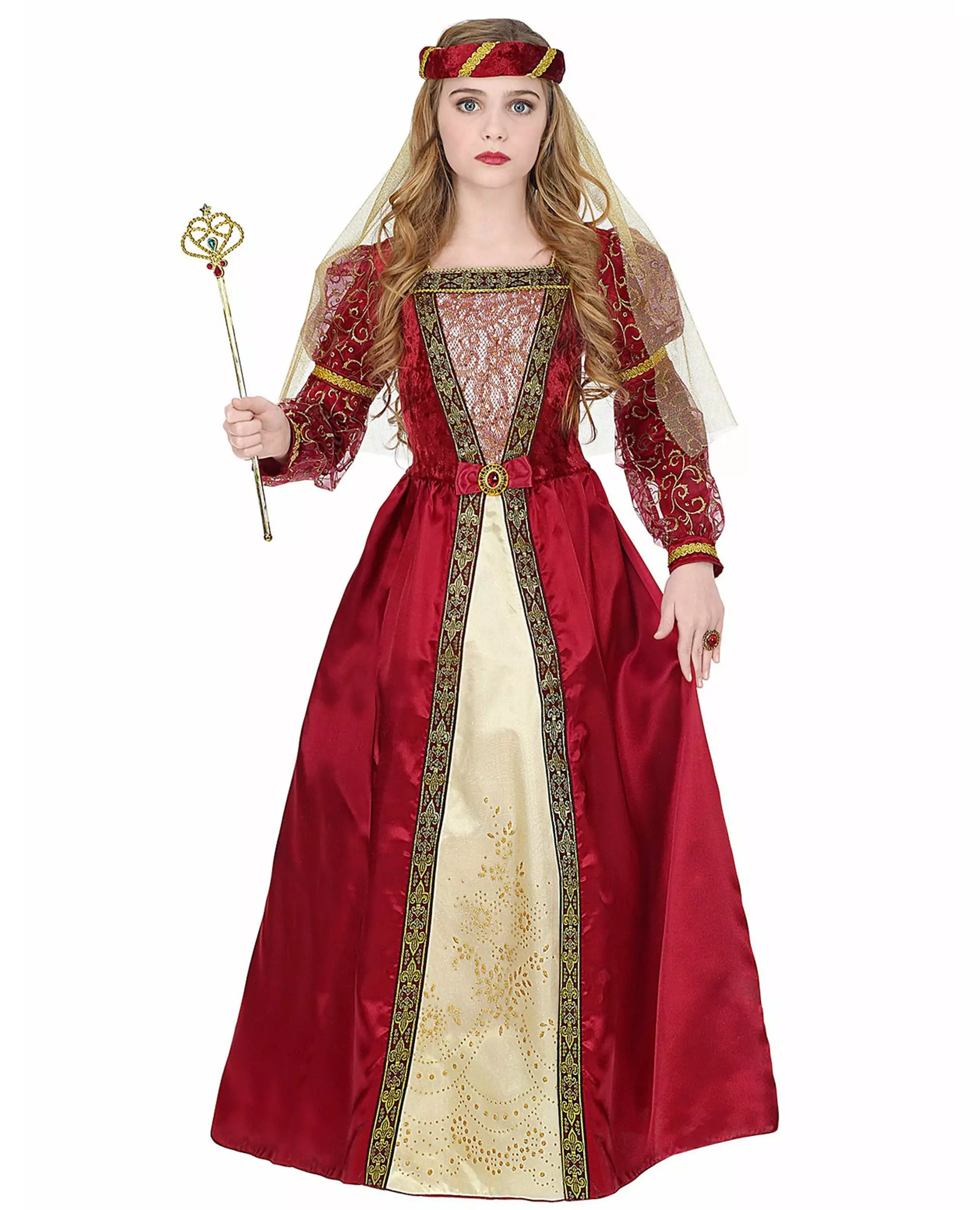 This medieval princess costume for girls includes a dress with a crinoline petticoat and a headdress with a veil. The long dress is made of red satin fabric. In the center of the bust is a yoke with rocard patterns. A pretty black and gold border highlights the curves of this pretty dress. The long sleeves are lined with a red veil with gold patterns. A fake belt cinches the waist. The bottom of this dress is flared. A crinoline petticoat is present under the dress to maintain the shape of this medieval princess dress. A medieval headdress in imitation red velvet fabric with a gold border and a gold veil complete this medieval princess costume. With this costume, transform your daughter into the most beautiful princess in the entire kingdom for Carnival, a themed fancy dress birthday party or even a medieval festival. Accessories included: Dress with crinoline petticoat Headpiece with veil Material: 100% polyester Care: Hand wash