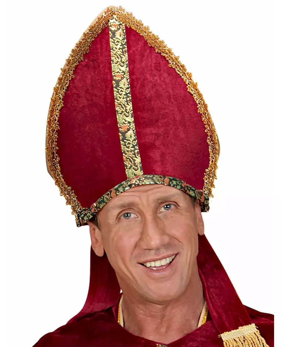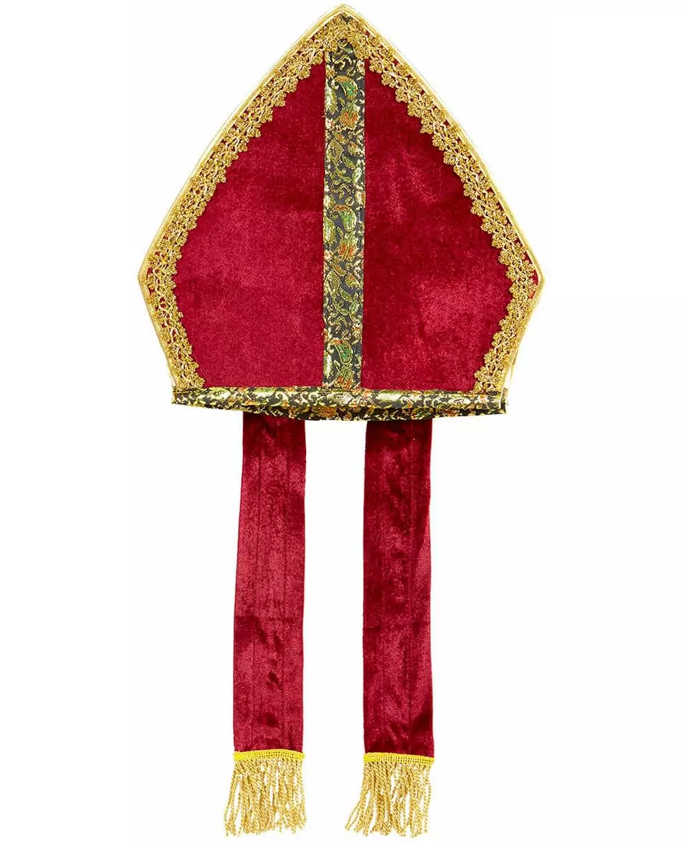 Nicholas of Myra. With this red velvet-look miter trimmed with gold and brocade edging, you can complete a bishop's costume for carnival or a Saint Nicholas costume for the end-of-year celebrations. Accessories included: Miter Material: 100% Polyester 100% Polyester