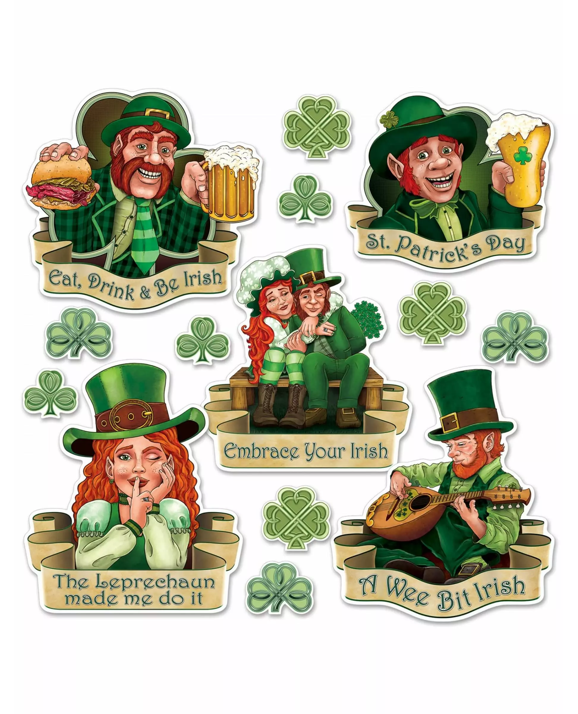 Create a pretty decoration for Saint Patrick's Day! These Saint Patrick's Day cutouts are made of cardboard. Depending on the design they represent, they measure between 8 and 37 cm. You will find leprechauns with beer, a guitar in hand, or even as a couple. Little messages are written underneath such as "St Patrick's Day", "A wee bit Irish", "Embrace your Irish"... The other, smaller cutouts represent small green clovers. It's up to you to decorate your walls with Saint Patrick's Day-themed cutouts! Accessories included: Cutouts