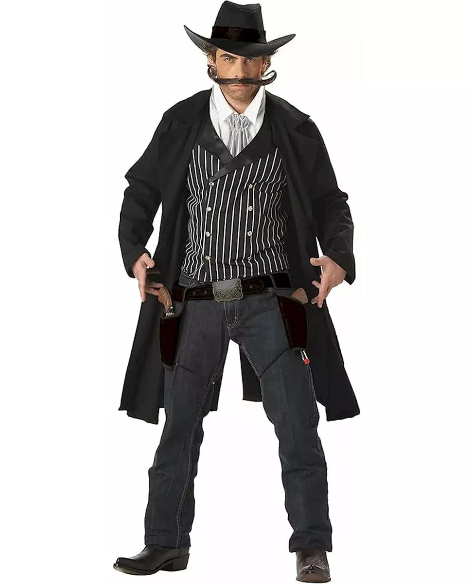 For cowboys who shoot faster than their shadow! This black cowboy costume consists of a coat, a vest, a tie, a hat, and two holsters (pants, shoes, T-shirt, beard, pistols, belt, and belt buckle not included). The cowboy jacket is predominantly black striped with two rows of buttons. His long black overcoat allows him to face the desert in case of a sandstorm, as does his black hat with curved brims. Finally, the black holsters on each side allow him to quickly draw in case of an attack. Ideal for a costume party with friends! Accessories included: Coat, vest, tie, hat, two cases Material: 100% polyester Care: Hand wash