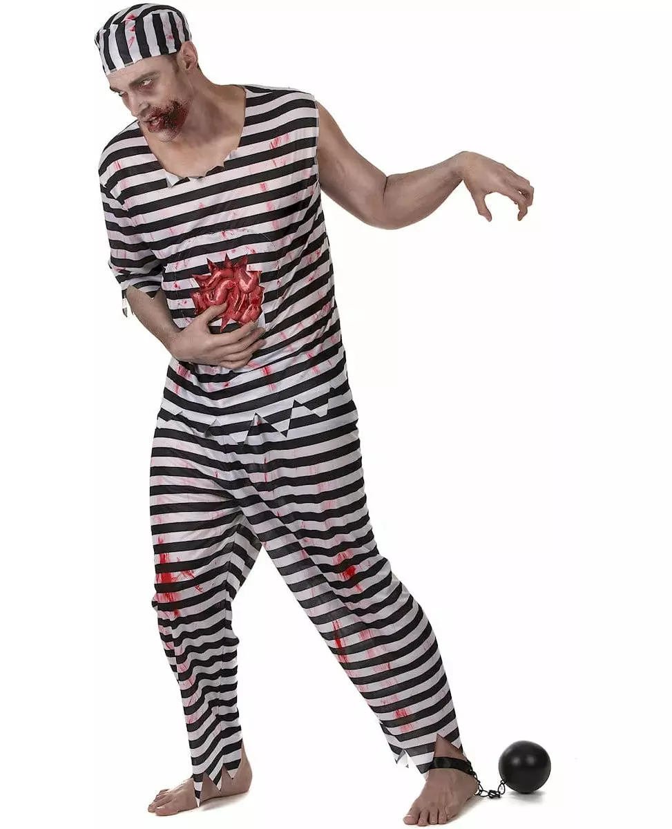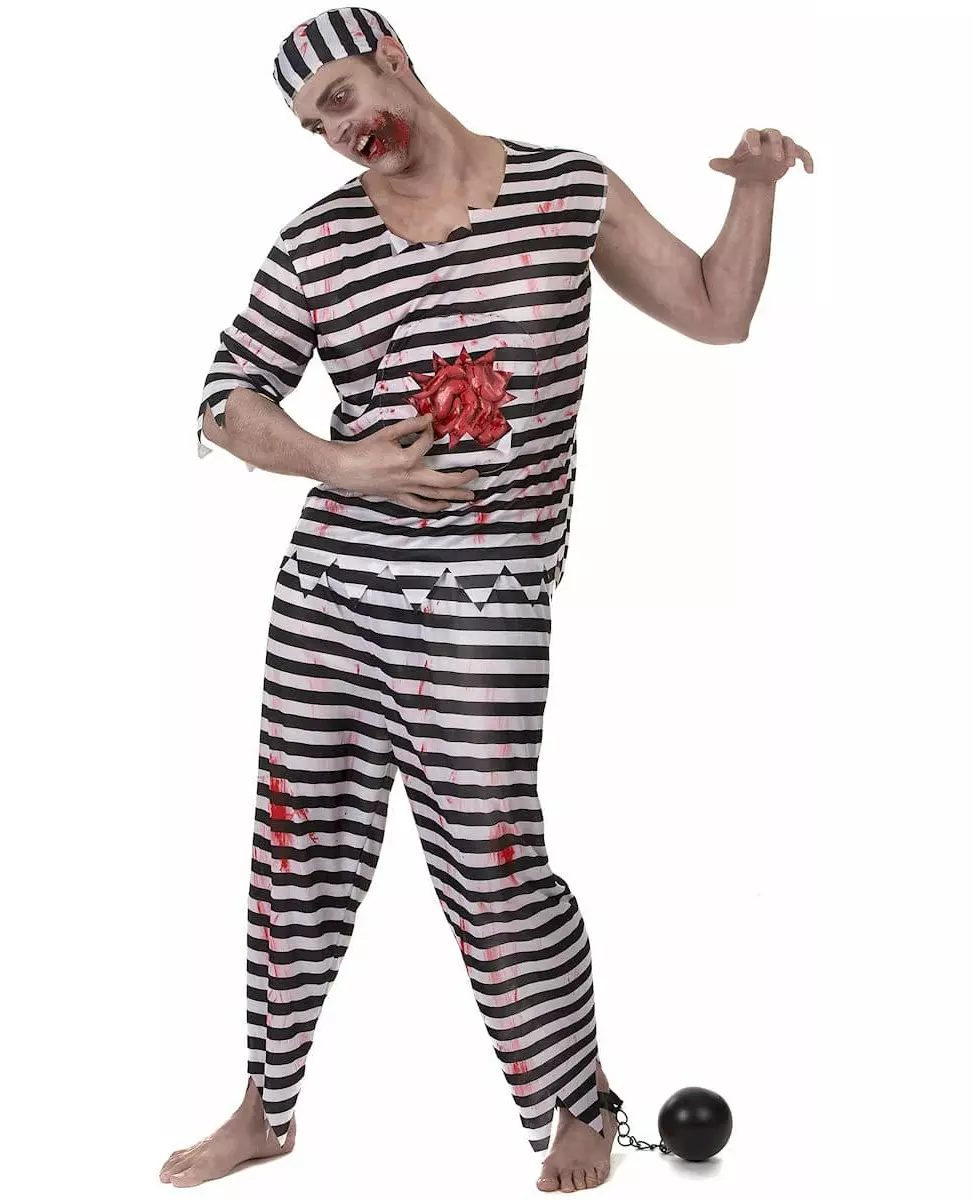 It's time to escape! This zombie prisoner costume is for men and includes a t-shirt, pants, and a headpiece (makeup and ball and chain not included). The top (asymmetrical at the sleeves) and the pants are striped in black and white. Blood stains cover the fabric cut into points at the sleeves, collar, waist, and lower legs. A large wound made of soft plastic representing viscera is sewn at the abdomen. The headpiece, made of fine, soft fabric, will fit all head sizes. This is the perfect costume for a successful Zombie Walk! Tip: Don't hesitate to Add even more fake blood splatters to accentuate the gore effect! Accessories included: Headpiece T-shirt Pants Material: 100% Polyester Care: Hand wash