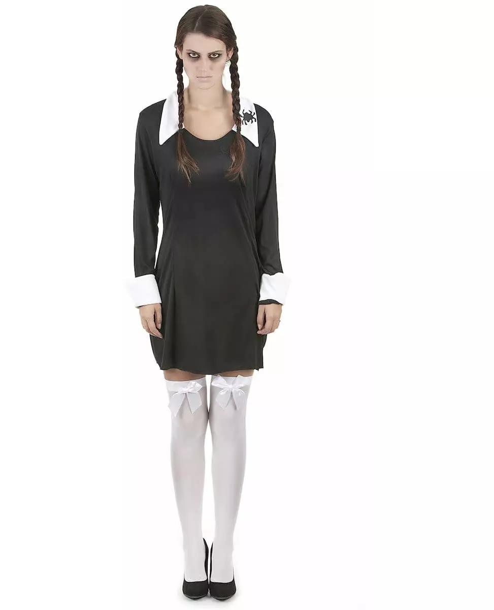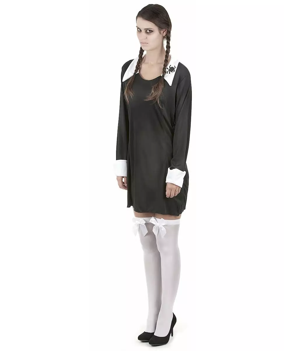 Play a dark schoolgirl to celebrate Halloween This schoolgirl costume for women consists of a dress (stockings and shoes not included). The short dress is black, with a white collar and cuffs. A black spider is depicted on the collar. This costume will be perfect for playing a dark schoolgirl on Halloween night or for a horror-themed party. Accessories included: Dress Material: 100% Polyester Care: Hand wash