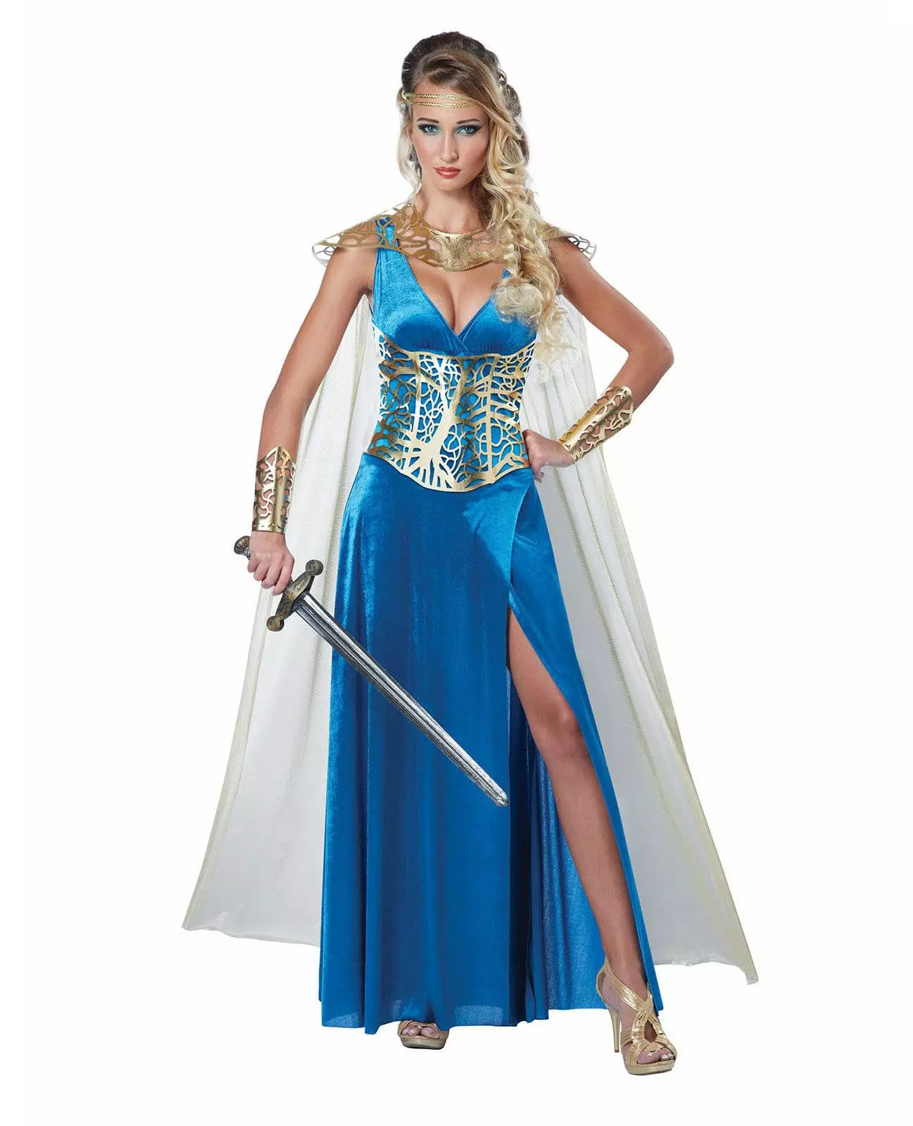 heavenly warrior dress to win every battle of seduction! This fantastic medieval warrior costume for women includes a blue dress with cape, a pair of cuffs and a shoulder pad (sword, head jewelry and shoes not included). The dress is cut from a shimmering fabric that will flatter your curves like a second skin. The deep V-neckline and the slit on the left leg are very striking! A golden bodice made of filigree floral patterns, two golden cuffs and a shoulder pad of the same style will attract all eyes. A white cape attached to the shoulder makes this costume perfect. In this ancient warrior princess costume, you will be admired not only at the medieval market, but also at the Carnival party or fancy dress party! It fits perfectly with accessories such as swords, makeup or jewelry from our online shop, with which you can perfect your splendid performance as a fighter!. Accessories included: Dress with cape Cuffs Shoulder pad Material: 100% polyester Care: Hand wash