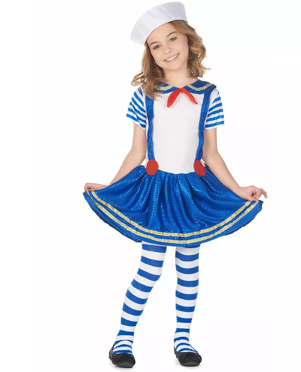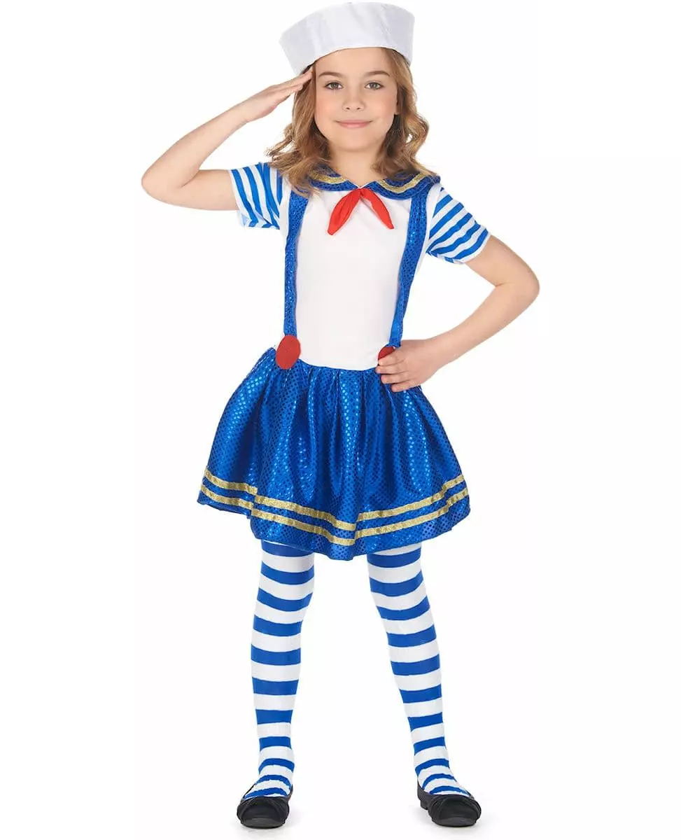 All aboard, sailor! This sailor costume for girls consists of a dress. The top of the dress is white with short sleeves in white and blue stripes. Straps and a blue sequined collar are sewn on the front. The bottom of the dress is made of the same blue sequined fabric. This dress closes in the back with Velcro. This sailor costume will be perfect for participating in the Carnival. Accessories included: Dress Material: 100% Polyester Care: Hand wash Measurement information: For a size 3/4 years (XS), dress is approximately 46 cm long
