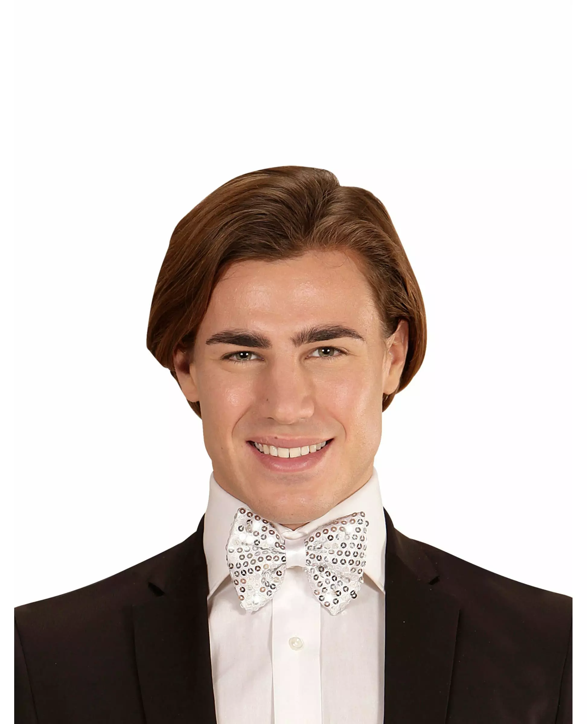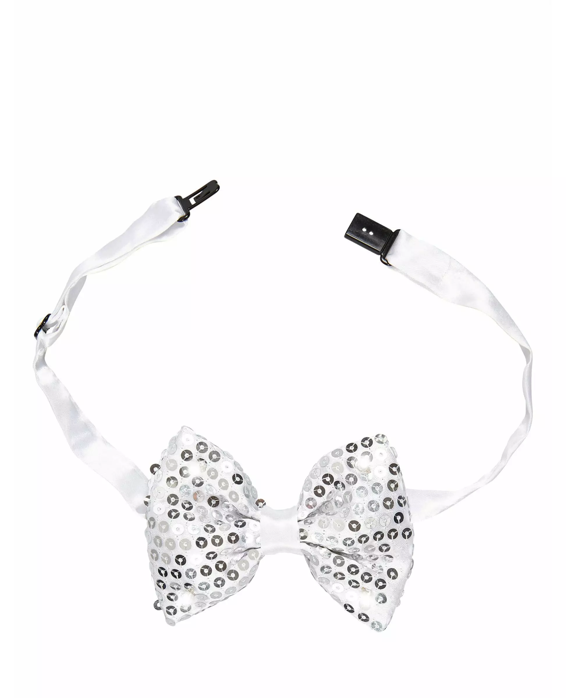 Chic and shocking This flashing LED bow tie is for adults (only the bow tie is included). It is white in color and is covered with silver sequins for a sparkling effect. It has 4 flashing LEDs. Press the "TRY ME" button to activate the light effect! The bow tie attaches around the neck with a clip closure. This bow tie will be perfect for a chic and shocking evening with friends! « © Copyright Widmann SRL» © Copyright Widmann SRL. Accessories included: 1 Bow tie Material: 100% Polyester Care: Hand wash