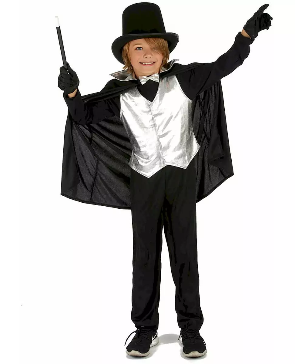 Alakazam! This magician costume for children includes a cape, a vest, and a pair of gloves. The soft, black cape fastens around the neck with a small Velcro fastener, decorated with a silver bow tie. A shiny silver collar can be worn either straightened or shaped as you wish. The vest is made entirely of shiny silver fabric and closes at the front with Velcro fasteners. The shape of its cut gives a very chic dimension to the garment. The included gloves are short and black. Does your child like to put on magic shows? With this costume he will feel like a real magician! Accessories included: Jacket Cape Gloves Material: 100% Polyester Care: Hand washable