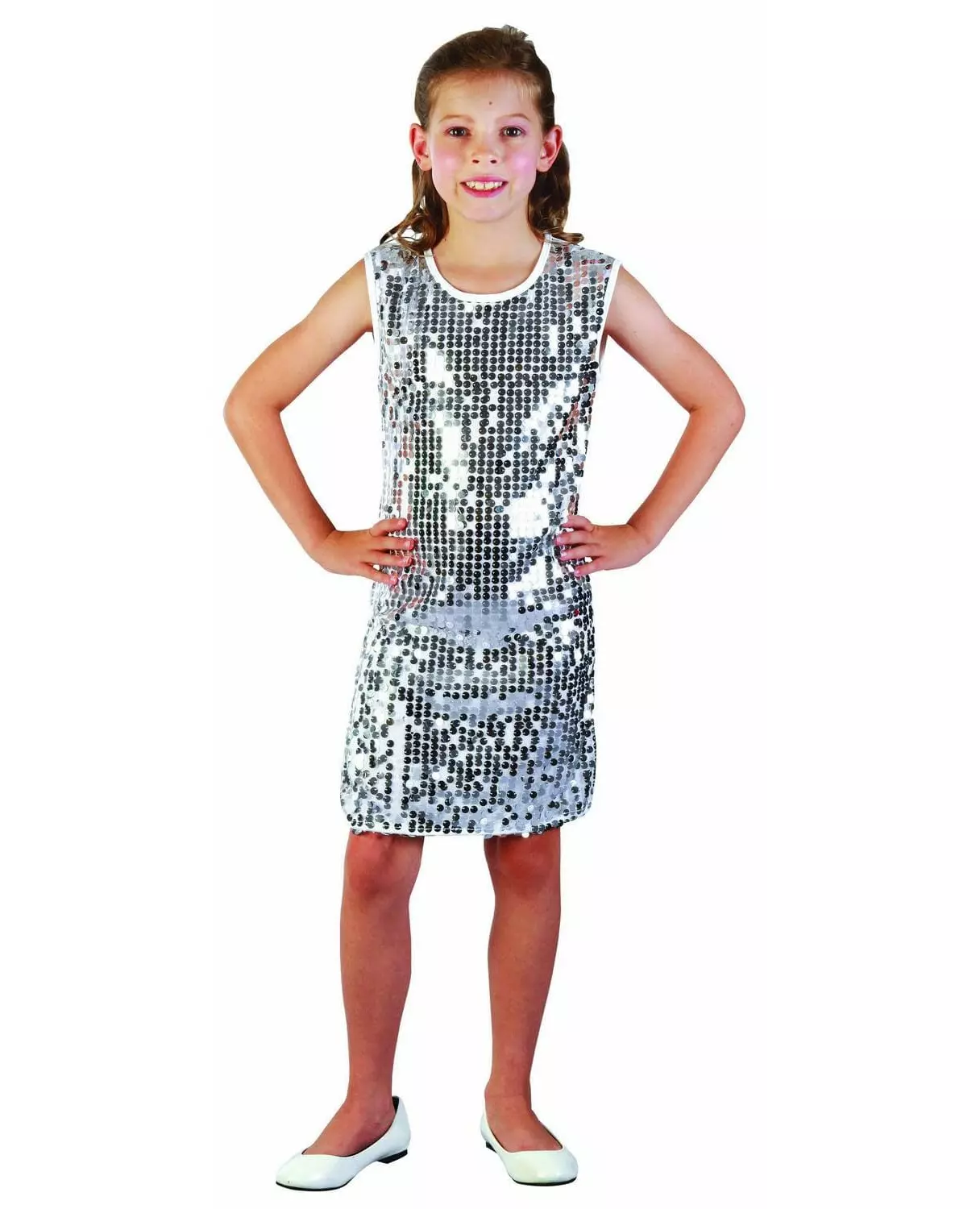 Sequined! This disco costume for girls consists of a dress sold separately. The dress is short and has flared sleeves. It has large silver sequins on the front and is plain white on the back. This costume will be perfect for carnival or any other 70s-themed event. Accessories included: Dress Material: 100% Polyester Care: Hand wash