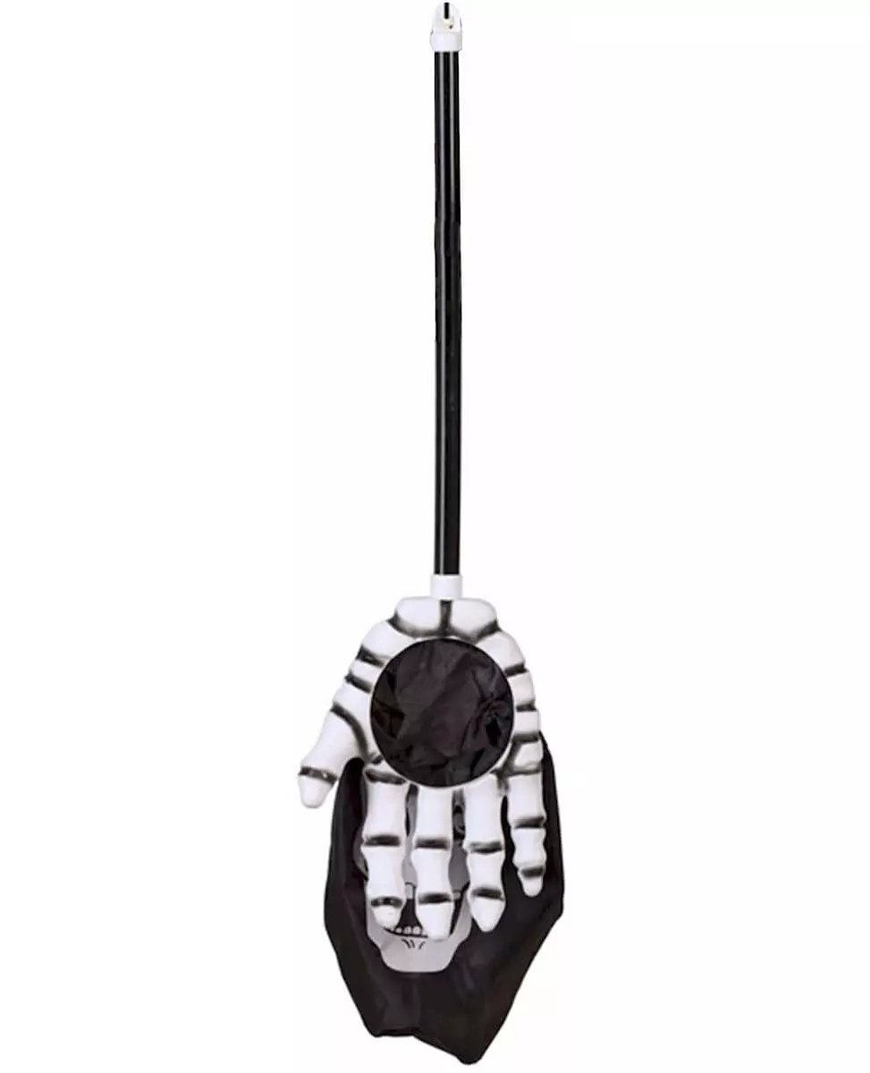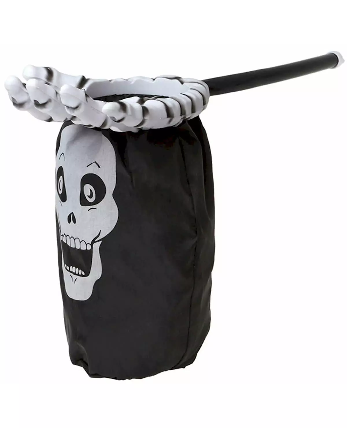 Beat the harvest record! This skeleton candy bag measures approximately 53 x 30 cm. It has a black handle making it easy to carry. At the end of the handle, you will find a white skeleton hand that served as an opening to put your candy in! The bag itself has a white skull printed on it. Make a splash for Halloween or a costume party with this magnificent bag! Accessories included: 1 candy bag Material: Polyester, plastic Care: Hand wash