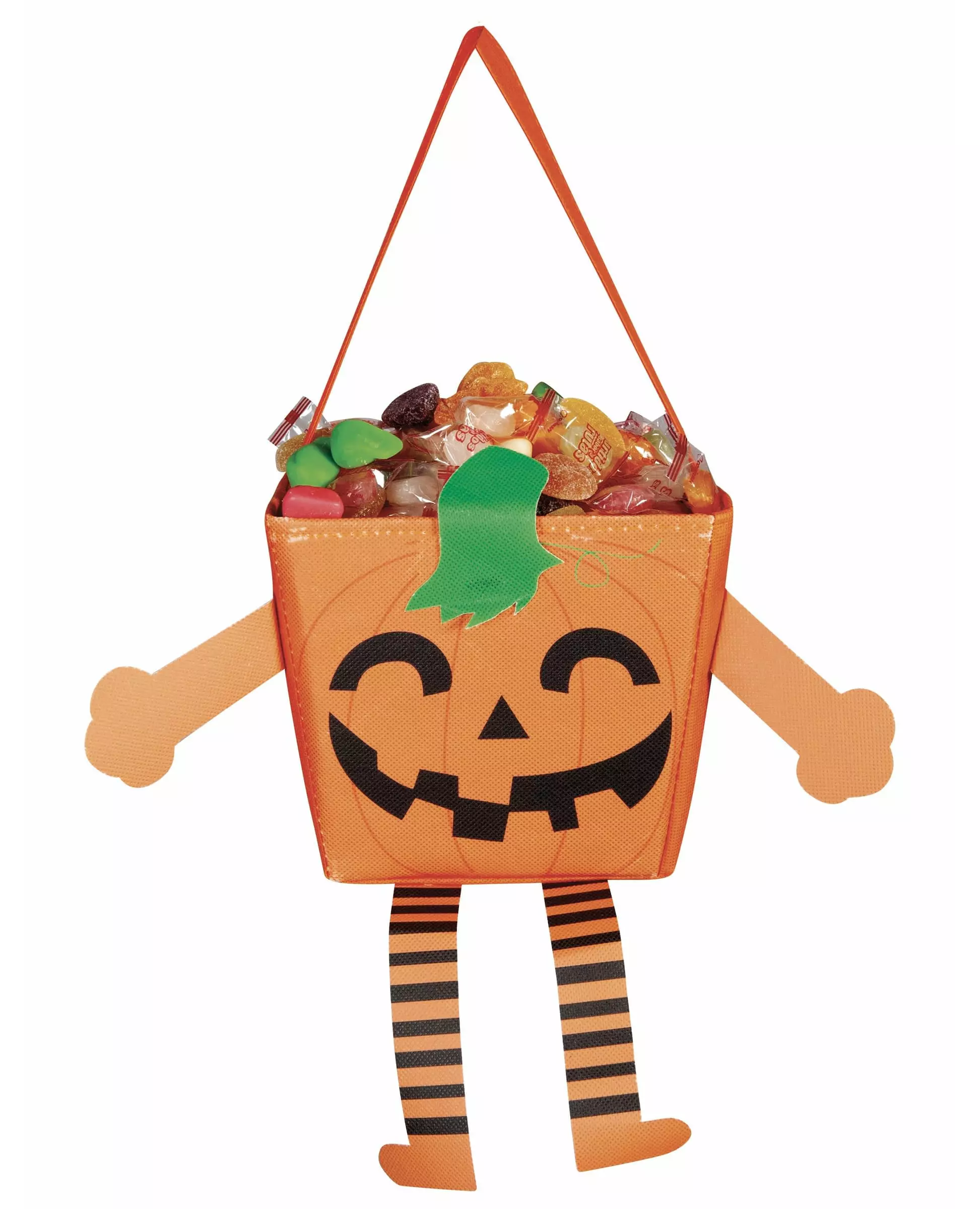 cute Halloween pumpkin This small orange pumpkin bag is made of fabric. It measures approximately 17 cm. Orange in color, this bag is printed with a black smiley face. A pair of black and orange striped arms and legs are also sewn to the bag. Finally, a handle will allow you to carry it by hand during your candy harvest. A perfect bag to accessorize a pumpkin costume on Halloween night. Accessories included: Bag Material: 100% polyester Care: Hand wash