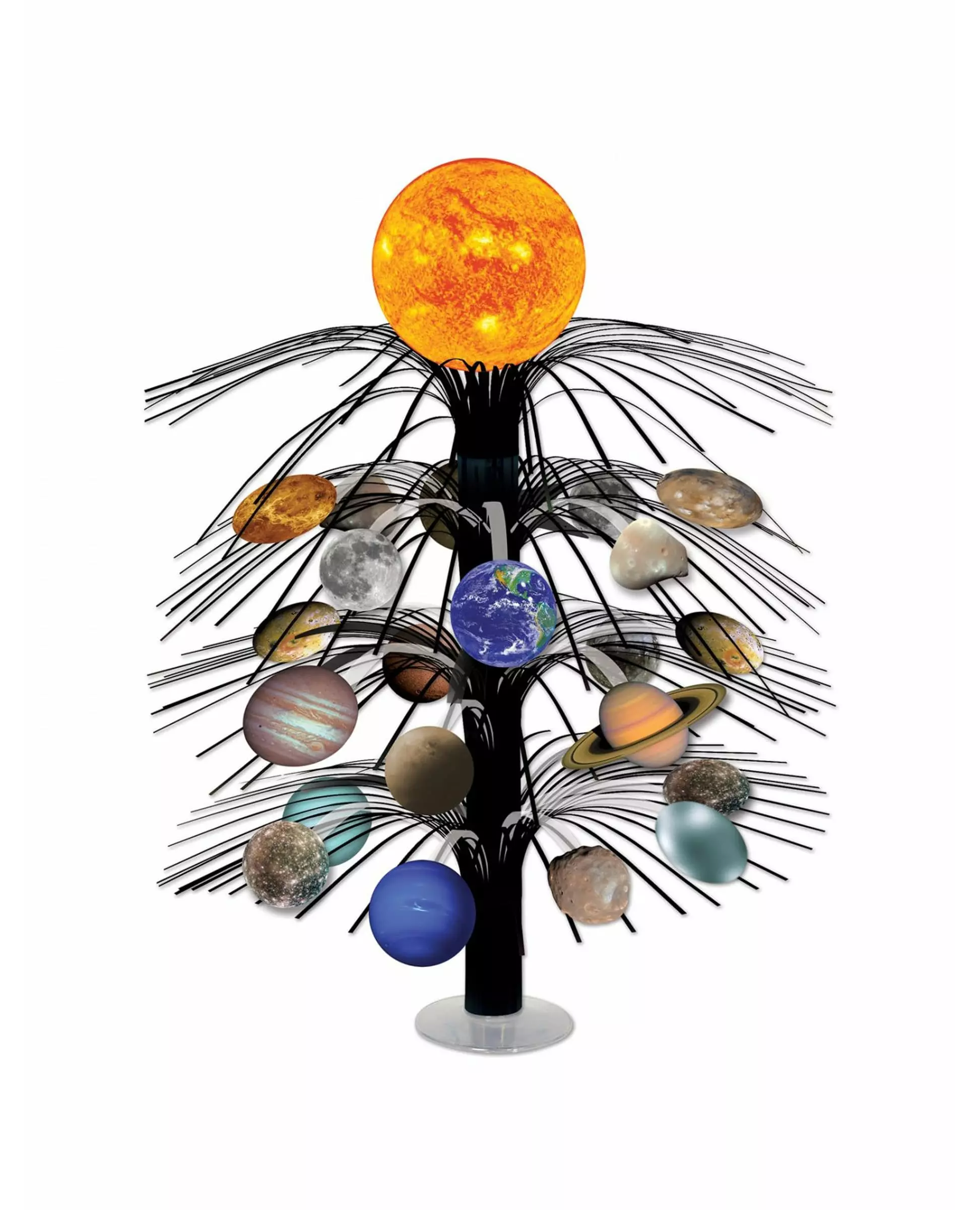 Decorate your table with a space theme! This centerpiece is space-themed. It measures approximately 45 cm. It is made up of black fringes and vignettes representing the planets of our solar system such as Saturn, Mercury, Earth... This centerpiece will be perfect for a space-themed birthday party. Accessories included: 1 Centerpiece