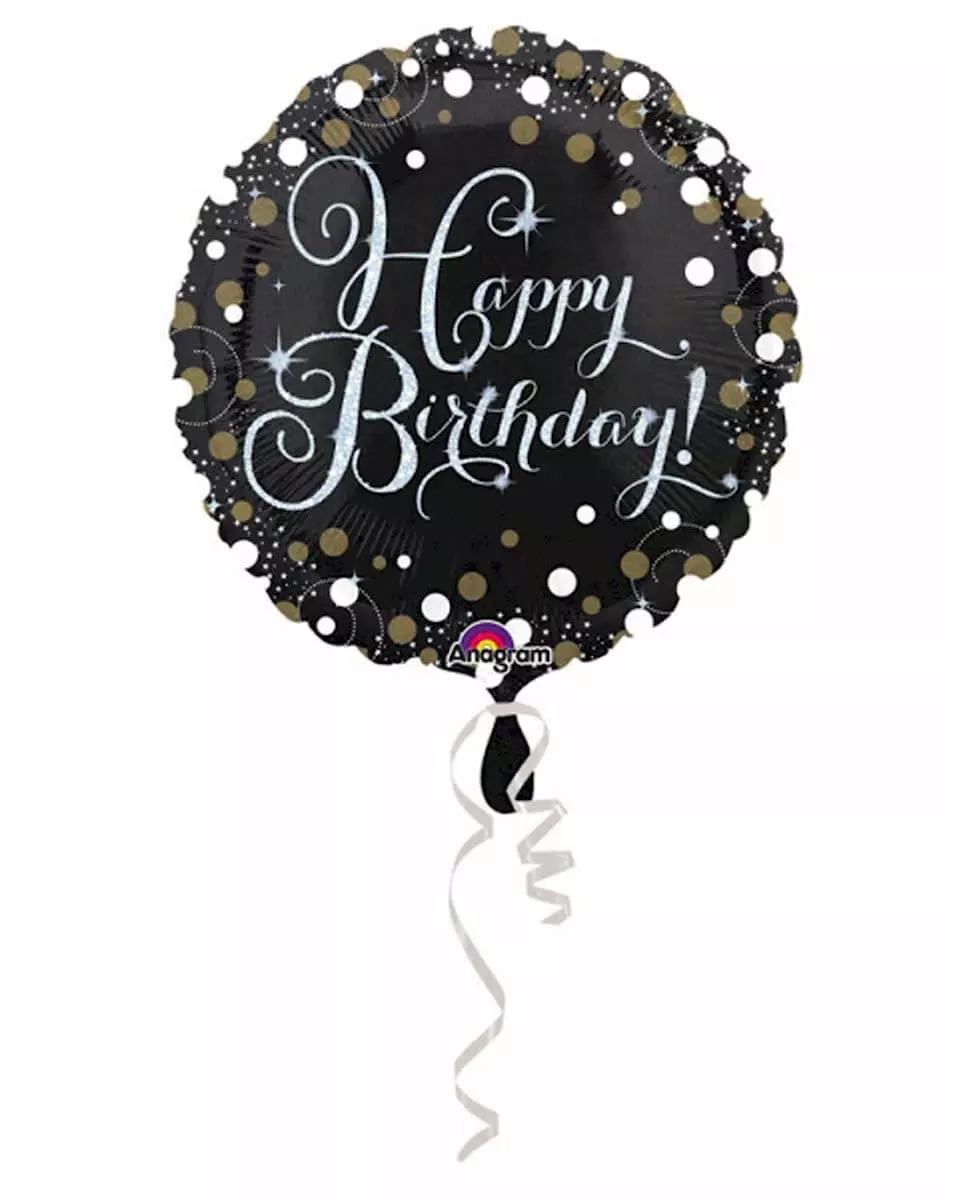 A chic and shiny birthday! This birthday balloon is made of aluminum. Mainly black, it is printed with the message "Happy Birthday" in silver letters, surrounded by white and gold confetti and glitter. Once inflated with air or helium, it measures approximately 45 cm. Opt for chic colors and patterns with this balloon for a trendy birthday decoration!. Accessories included: 1 balloon Material: Aluminum