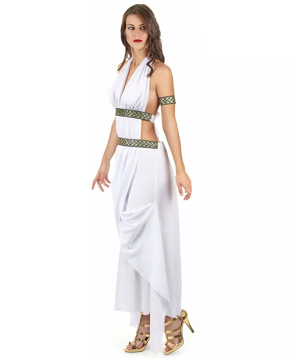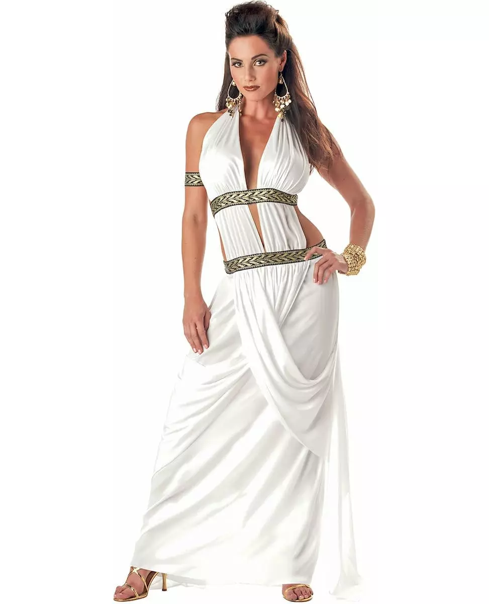 Embody a worthy queen! This Spartan Queen costume consists of a dress and an armband. (jewelry and shoes not included) The dress is very feminine. White in color, it is long and the fabric, quite heavy, will fall perfectly. The top of the costume consists of two elements to tie behind your neck using ribbons provided for this purpose. The top of the costume is very low-cut and slit at the navel. Around the waist and hips, black bands with gold embroidery are sewn. You can also cinch the outfit with ribbons. This way, you can easily adapt your dress to your body shape. The dress's waist and chest circumference are elastic. It will therefore be practical to put on. Finally, a strip of fabric will fall elegantly along your thighs and create a very authentic drape. The armband will adorn either your wrist or your arm. It uses the embroidery described above, where laurels are represented. This very sexy costume will make its effect during a costume party or for a show. Accessories included: Dress Armband Material: 100% Polyester Care: Hand wash