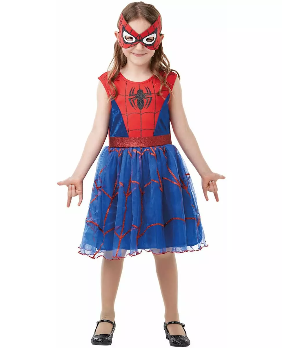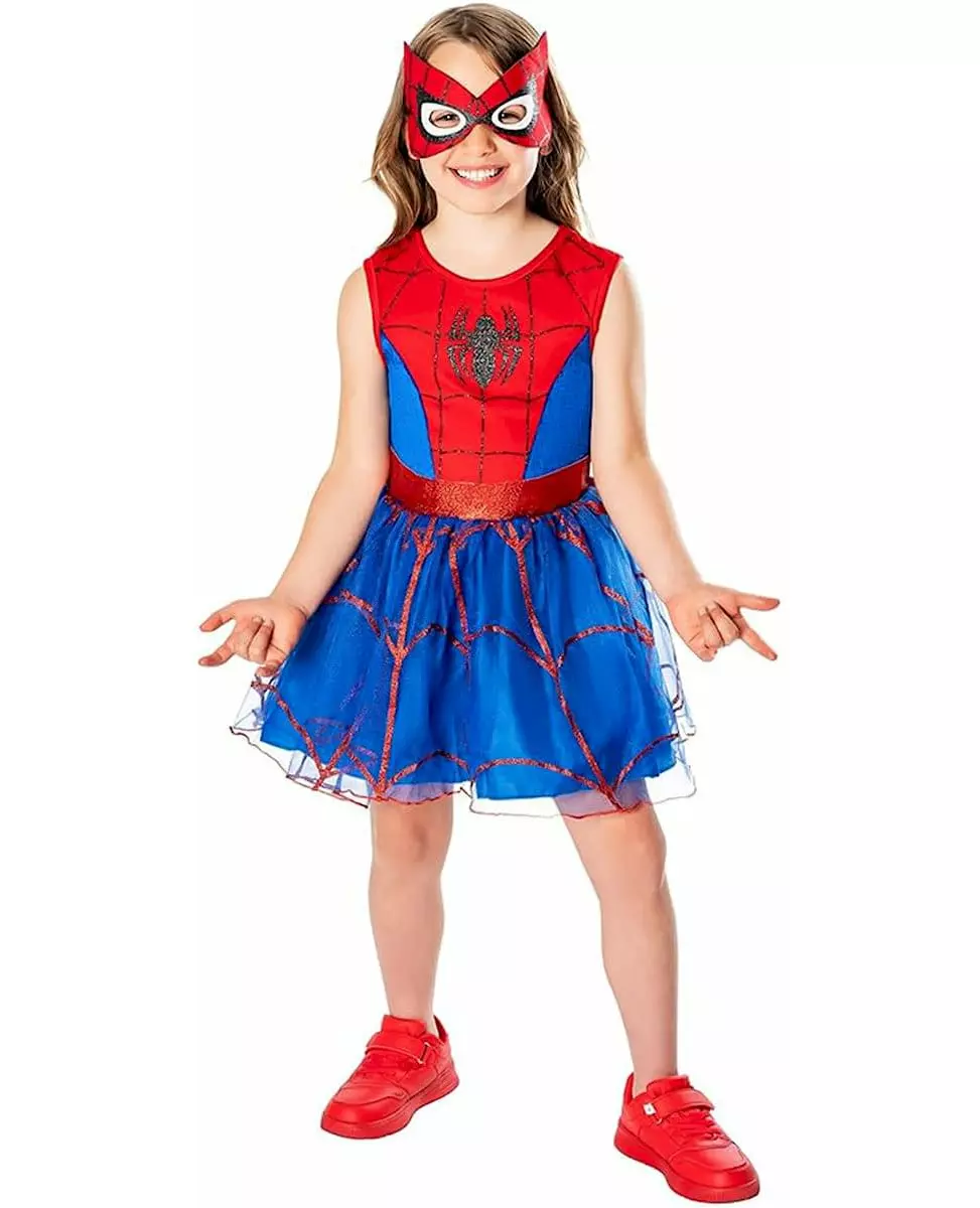 superheroine ready for action! This Spider-Man™ tutu dress for girls includes a sleeveless dress and a matching mask. The top of the dress faithfully reproduces Spider-Man's iconic motifs, with his famous spider logo printed on a red mesh-effect background. The waist is highlighted by an integrated sequined belt, adding a touch of sparkle to the ensemble. The blue tulle skirt is decorated with red sequined webs, for a captivating visual effect with every movement. The fabric mask, the image of the superhero, complete this outfit with style and mystery. Perfect for Carnival, a birthday or a costume party, this dress will make your child a superhero as brave as she is elegant. Accessories included: 1 Dress 1 Mask Material: 100% Polyester Care: Hand wash
