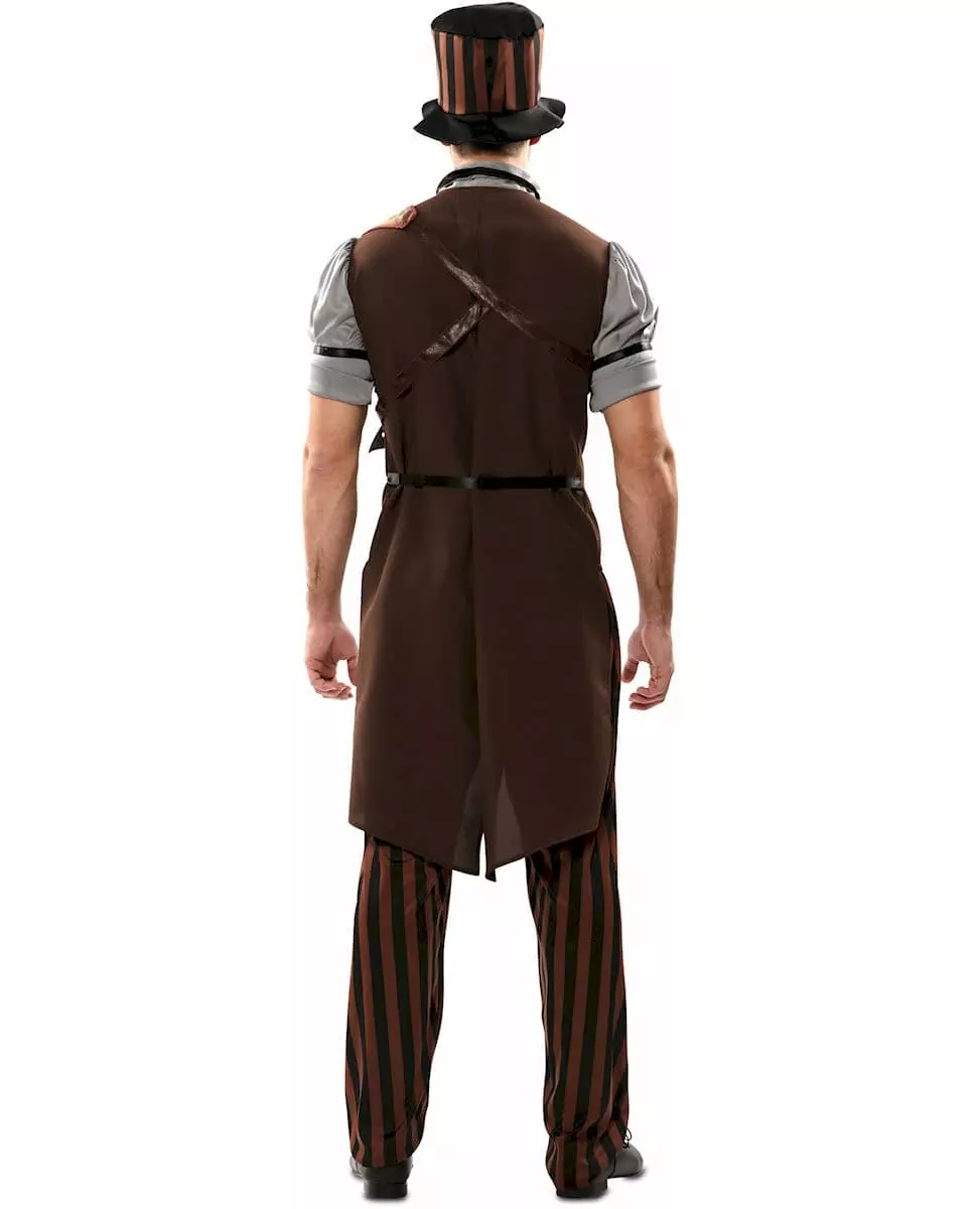 Steampunk Aviator This men's Steampunk costume includes a shirt with a waistcoat, pants, a chest belt, and a hat. The shirt is gray with short rolled-up sleeves; a brown waistcoat is sewn on top. A row of fake gold buttons is present on the waistcoat. The waistcoat has a long tailcoat on the back. A chest belt is placed on the waistcoat. It is made of brown imitation leather straps. The belt is adjusted on each side thanks to a gold buckle. The pants have brown and black vertical stripes. The hat, matching the pants, is an original top hat. Fake aviator goggles are also sewn onto the hat. This complete Steampunk costume will be perfect for your Carnival and fancy dress parties. Accessories included: Shirt with vest Pants Chest belt Hat Material: 100% polyester Care: Hand wash