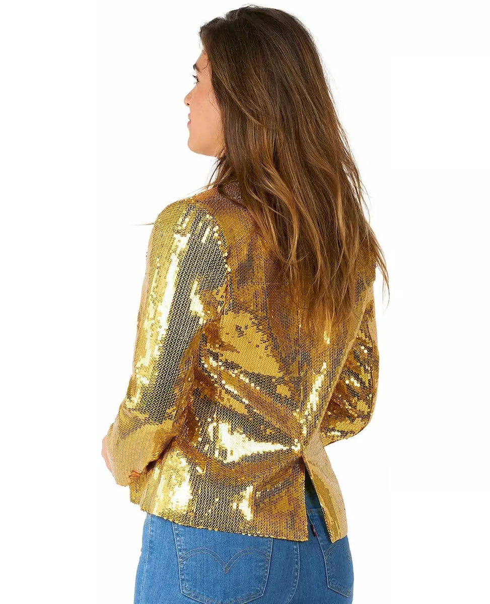 Sparkling elegance! This Suitmeister™ women's gold sequin blazer jacket is perfect for shining on any occasion. With its luminous gold sequins, it catches the light with every movement and ensures a chic and bold look. Its fitted cut and button closure elegantly accentuate the silhouette. Perfect for a disco night, a glamorous event, or simply to add a touch of sparkle to your outfit! Material: 100% Polyester. Accessories included: 1 jacket