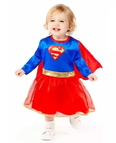 super cute heroine! This officially licensed Supergirl™ costume is for babies. This set includes a printed dress and a cape. The girl's printed dress features a satin blue long-sleeved top, a red collar, and the official red and yellow Supergirl™ sign on the front center section. A fake gold belt is also present. The costume dress is red with a loose effect throughout. It has a gold border on the bottom. A small red cape will be integrated into the Overall, you can easily attach it with a Velcro fastener at the back of the top. Succumb to this magnificent Supergirl™ costume at a superhero-themed party or for Carnival! Accessories included: Printed dress Cape Material: Polyester Care: Sponge clean only - Do not tumble dry