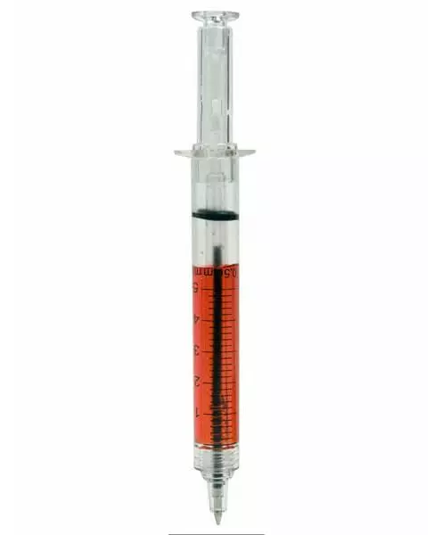 Don't be afraid of needles! This pen is shaped like a syringe. There is a red liquid inside for added realism. It measures 13 cm in length. This pen will be perfect for playing a joke on those around you or to complete your nurse's outfit. « © Copyright Widmann SRL ». © Copyright Widmann SRL. Accessories included: Pen