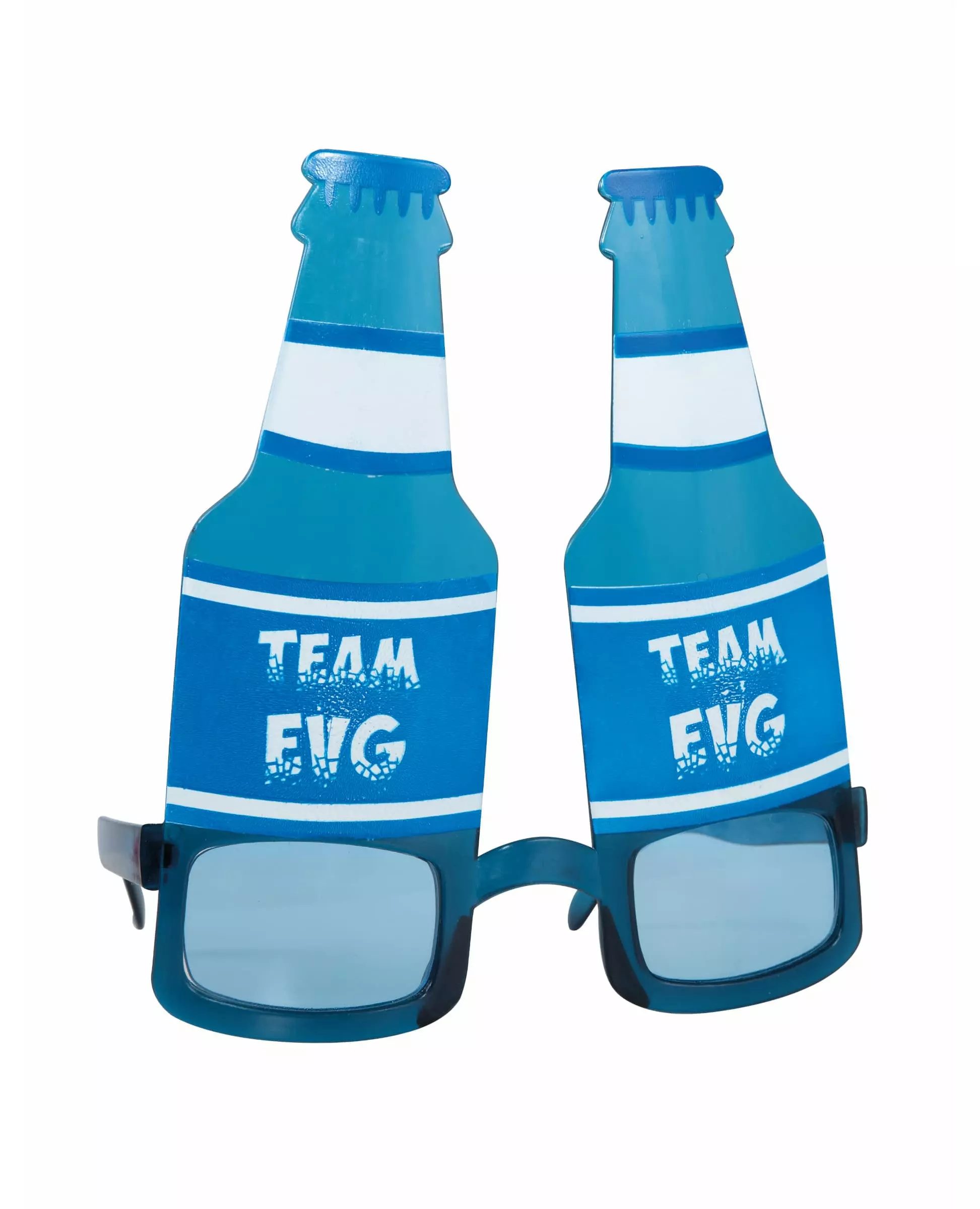 Team groom-to-be! These Team stag beer bottle glasses are for adults. Made of plastic, the frame and lenses are blue. The glasses are topped with two beer bottles bearing the inscription "Team stag" in white letters. These Team stag beer bottle glasses will be perfect for getting together for a stag party!. Accessories included: Glasses
