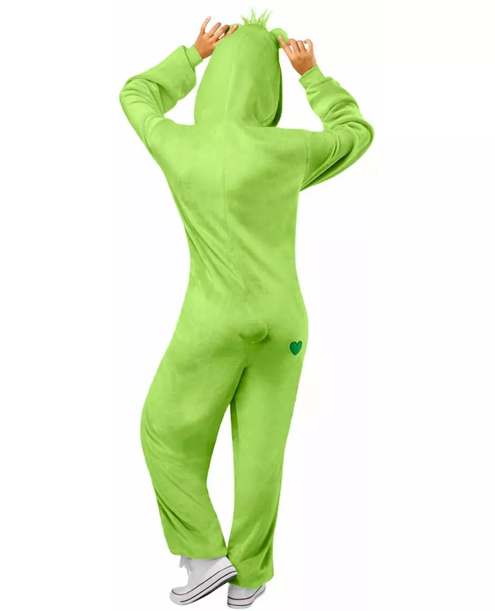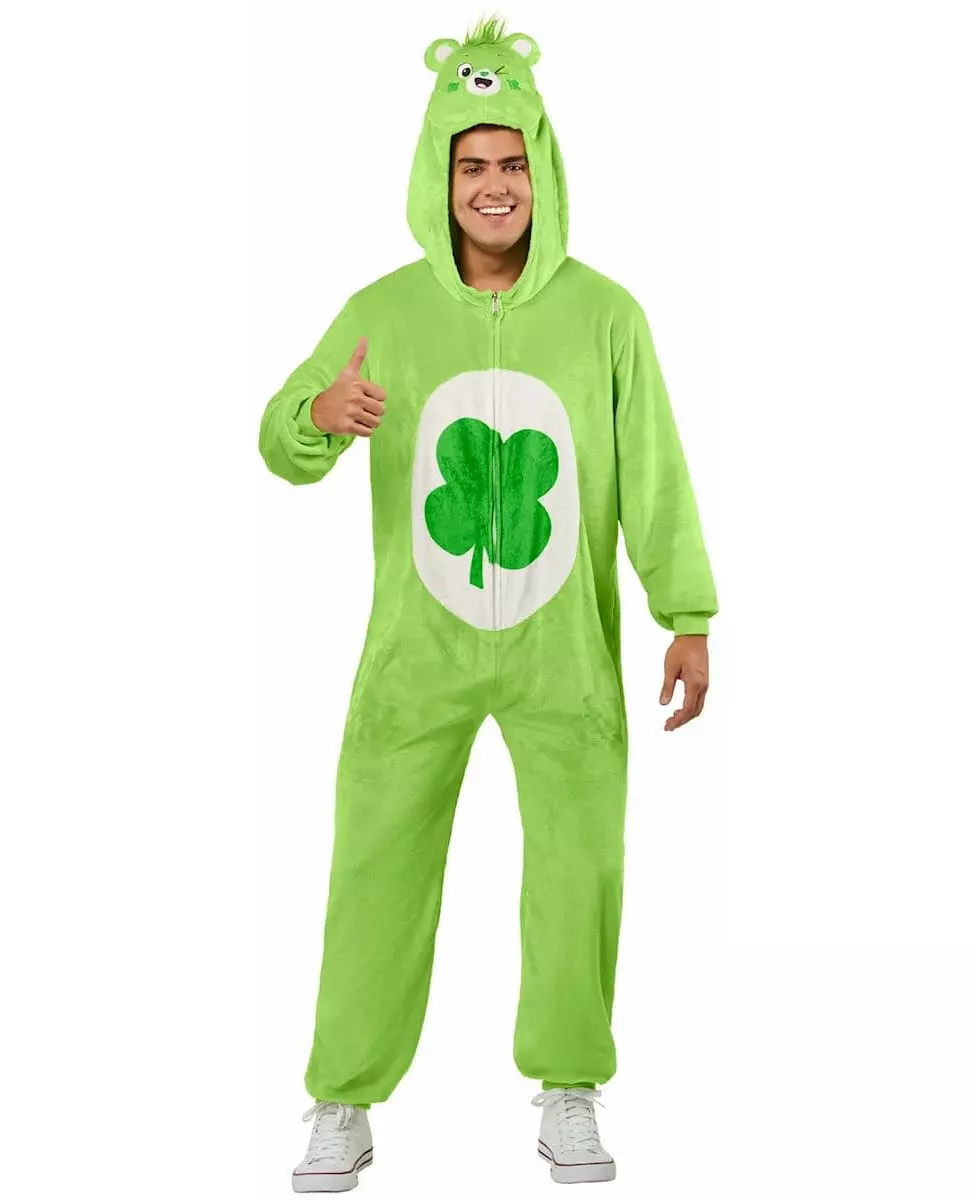 Bring a touch of luck and happiness to your Birthday! This officially licensed Care Bears™ green adult costume features a soft hooded jumpsuit. The jumpsuit is bright green in color and features characterful Care Bears™ details, such as his famous four-leaf clover badge on his stomach. It is made from a plush material that offers Care Bears™ softness. The jumpsuit has a front zip, perfect for easy dressing. The attached hood features Care Bears™'s cheerful face, complete with adorable ears and a sweet smile. With this green Care Bears™ costume for adults, you'll be ready to spread luck and good humor wherever you go during Carnival or on your birthday!. Accessories included: 1 Jumpsuit Material: 100% polyester Care: Hand wash