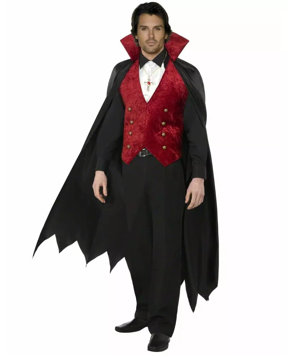pieces! This vampire costume consists of a cape, a vest and a jabot (shirt, pants and shoes not included). The cape is satin black with a scalloped finish on the bottom, the inside of the collar is in red velvet, the red velvet effect vest also attaches with Velcro on the cape. The jabot is satin white; it attaches around the neck with Velcro. This costume is perfect for Halloween or your theme parties. Accessories included: Cape Vest Jabot Material: 100% Polyester Care: By hand