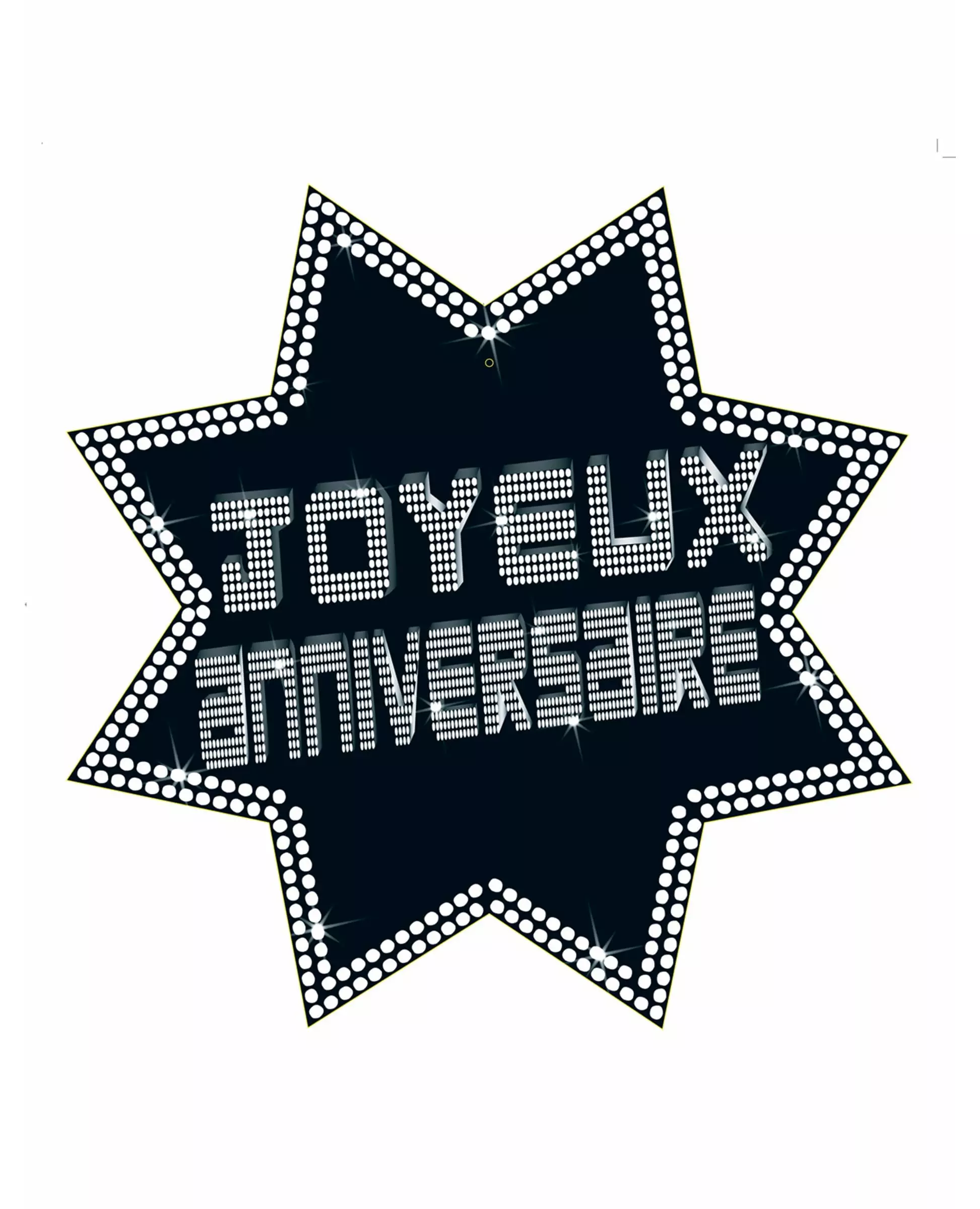For a great birthday! This birthday decoration is star-shaped. It is made of black cardboard and has the words "Happy Birthday" in white letters and printed on both sides. It is also bordered with sparkling white dots. A small notch is provided to allow it to be hung on a wall. It measures 34 cm long and 32 cm wide. This wall decoration will perfectly complete your decoration at your birthday party! Accessories included: 1 wall decoration Material: Cardboard