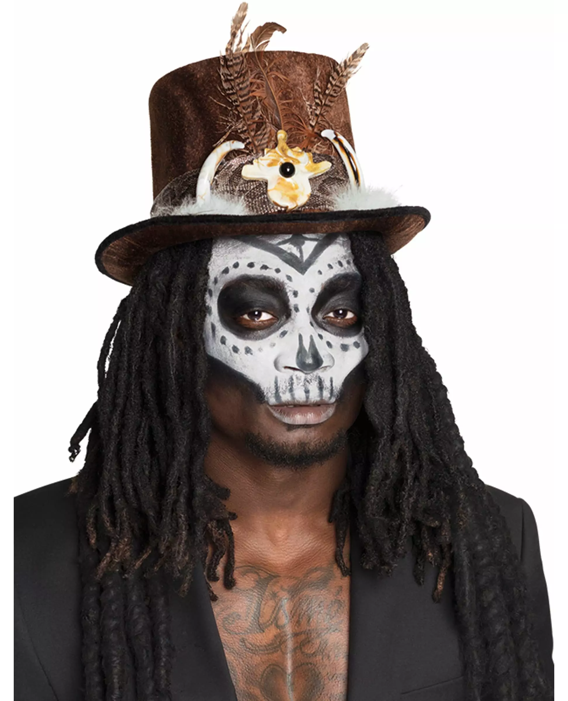 hellish hat for a macabre look! This hat is a voodoo hat with hair. The hat is made of brown animal skin effect fabric edged with a black velvet fabric band. A shiny brown snake scale effect ribbon decorates this hat. It is also adorned with fake feathers (three brown and two white) and fake animal bones. To finish this hat is embellished with long, black dreadlocks for a dark and macabre look. This terrifying hat will be perfect to complete your Halloween costumes or at fancy dress parties!. Accessories included: 1 Hat Material: 100% polyester Care: Hand wash