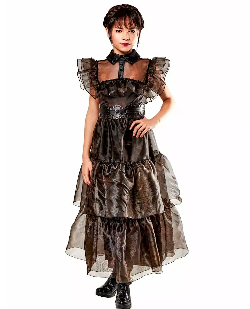 The inimitable Wednesday Addams™! This ball costume is officially licensed by Wednesday Addams™. It includes a dress and a belt. The dress is long and black. It has ruffles and is made of velvet fabric with a satin effect. The sleeves are short and decorated with a velvet border that goes down to the chest. The small black collar gives a more original touch. The belt will highlight your waistline. With black ankle boots and braided hair, you will transform yourself into Wednesday Addams™! Perfect for a Halloween costume party, for example! Accessories included: Dress Belt Material: 100% Polyester Care: Hand wash