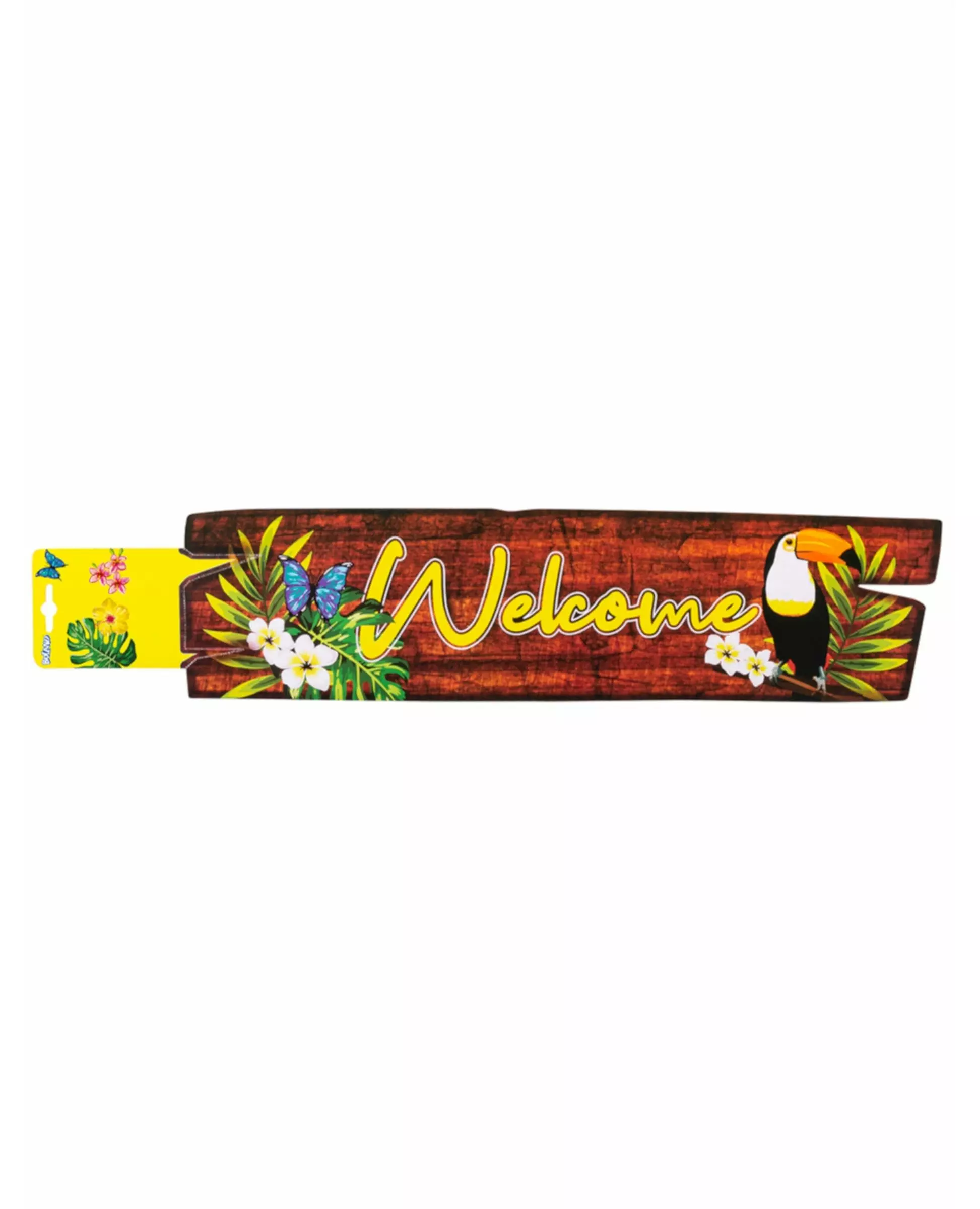 welcome toucan party decoration! This cardboard wall decoration measures approximately 60 x 13 cm. It represents a wood-colored sign on which a toucan is represented and where "Welcome" is written in yellow. This wall decoration will be an ideal decoration for your Hawaiian party or jungle birthday!. Accessories included: 1 Wall decoration Material: Cardboard