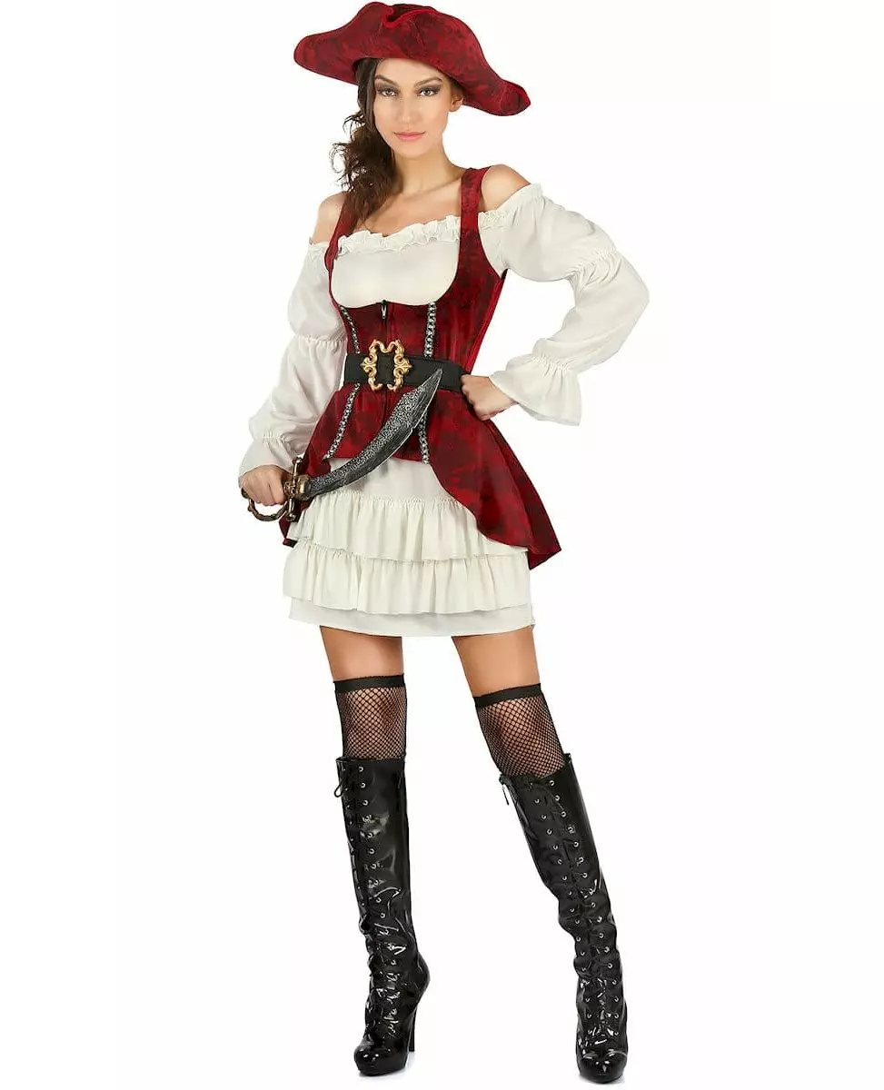 very beautiful pirate! This sexy pirate costume includes a dress, a vest, a hat and a belt. The frilly dress is short and white with puffed sleeves. The red vest with thin straps and long at the back is decorated with baroque patterns. A matching tricorn hat and a belt complete the outfit, comfortable and adaptable to your figure. This pirate costume for women is very aesthetic and perfect for a Carnival or a pirate-themed fancy dress party. Accessories included: Dress Vest Hat Belt Material: 100% Polyester Care: Hand wash