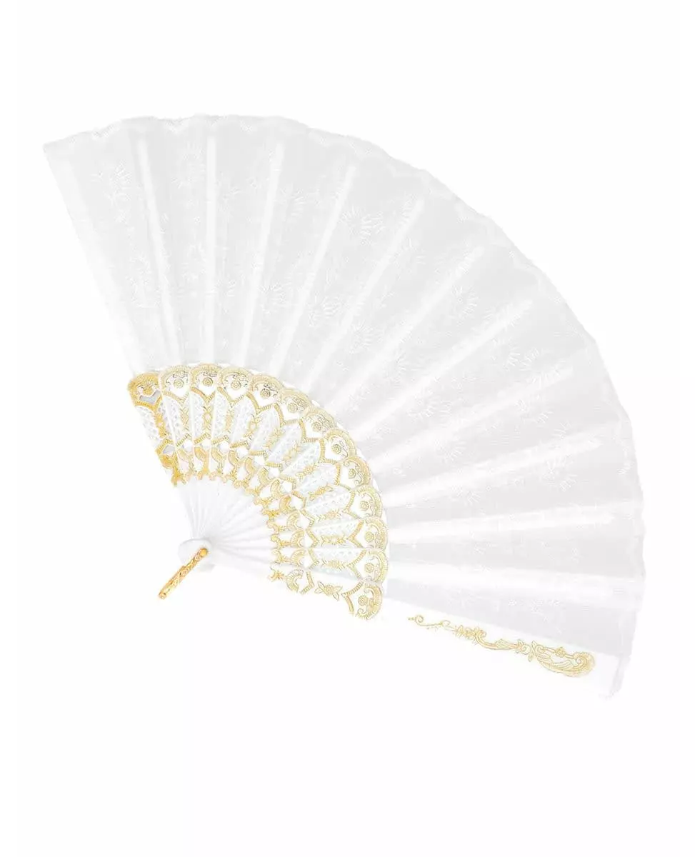 With embroidered white fabric! This beautiful white rigid plastic fan has gold finishes on the plastic. Once unfolded, its maximum length is approximately 43 cm from one end to the other and approximately 23 cm in height (gloves not included). This fan will be the ideal accessory to complete a disguise during your costume parties with friends or any other themed event. Material: Plastic and polyester fabric