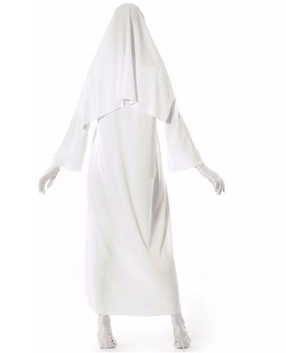 Dress up as a ghostly nun for Halloween This women's costume consists of a dress and a headdress (necklace, gloves and shoes not included). This white dress is long and has long, flared sleeves. The headdress is also white and falls over the shoulders. Become a ghostly nun for Halloween to scare everyone around you! Accessories included: Dress Headdress Material: 100% polyester Care: Hand wash