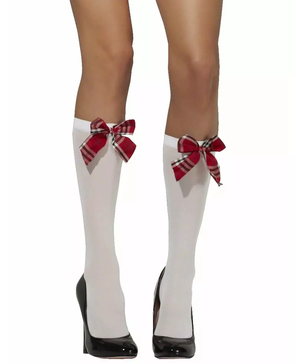 Did you study well? This pair of women's white stockings features a red, white, and black checkered bow at the top. They'll be the perfect complement to a sexy schoolgirl outfit for a themed party with friends or to celebrate the end of the school year. Accessories included: Pair of stockings Material: 100% Polyester 100% Polyester