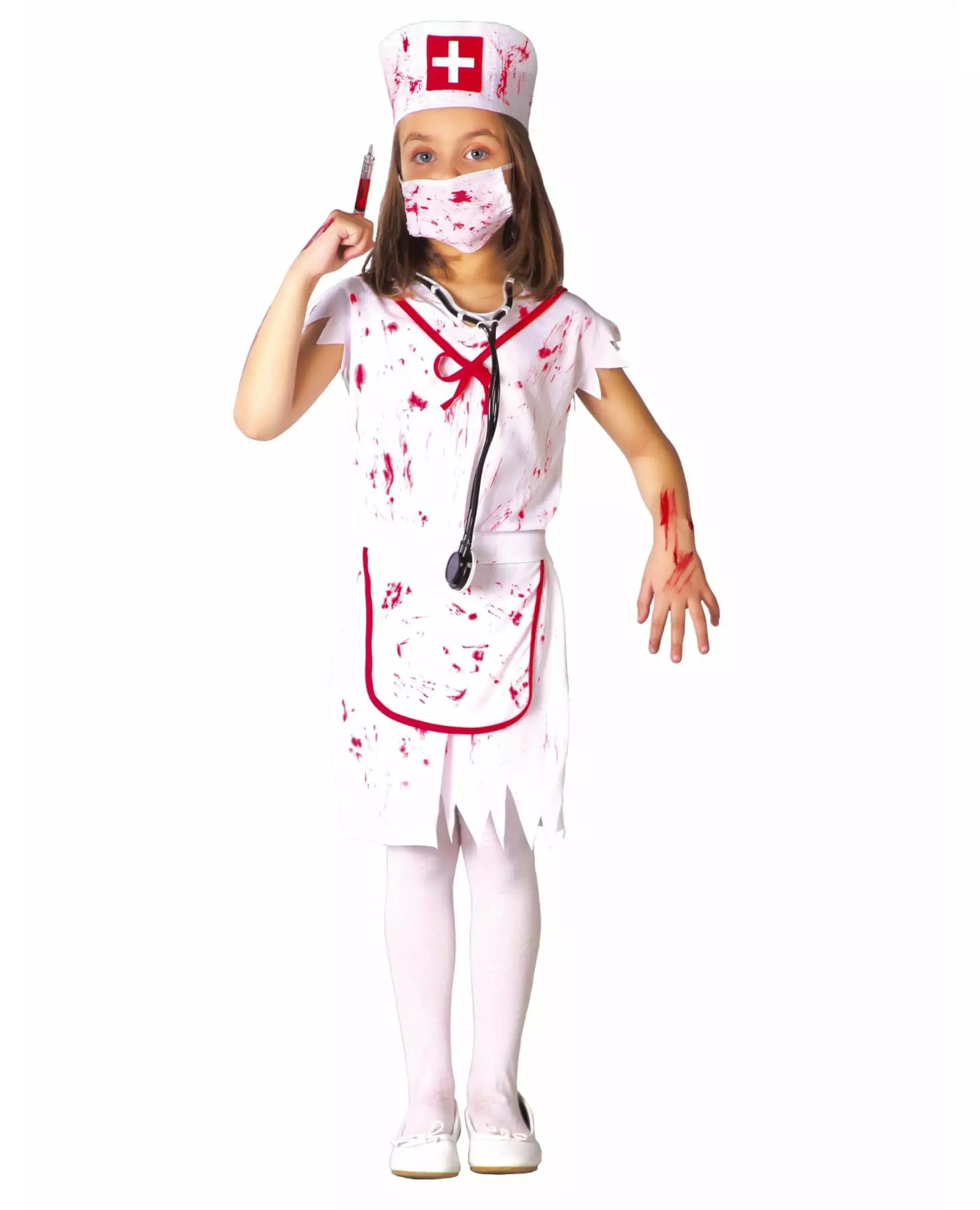 terrifying treatment! This white zombie nurse costume is for girls. It consists of a headdress, a mask, a dress, and an apron. The headdress of the costume looks like a doctor's cap, it is bloody white with a red and white cross on the front. A bloody mask and a stethoscope will complete the outfit. The mask will be held around the ears with an elastic band. The dress of the costume, mid-length, is white with a bloody appearance all over. The top and bottom finishes are cut into points to accentuate the scary side of the caregiver! An apron of the same color is added to the costume. This costume will be perfect to embody a zombie nurse on Halloween night! Accessories included: Headpiece Mask Dress Apron Material: Polyester Care: Hand wash