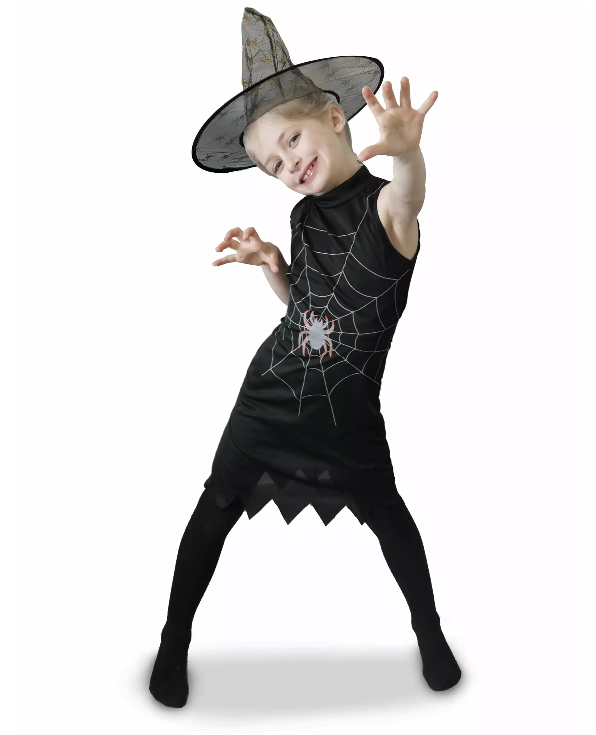 Become a real witch for Halloween! This witch costume consists of a dress and a hat (tights not included). The black dress is sleeveless and is decorated with a spider on its web. The bottom of the dress is cut into a point. The witch hat is made of transparent black fabric. Go trick-or-treating by dressing up as a real witch on Halloween night! Accessories included: Dress Hat Material: 100% polyester Care: Hand wash