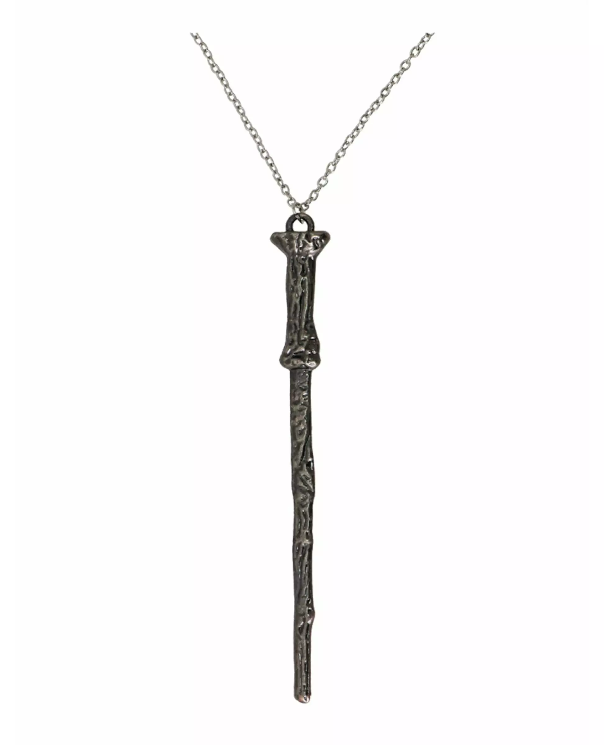 Expelliarmus! This wizard wand necklace has a silver-colored chain and a metallic-colored wizard wand pendant. This accessory will be perfect for a themed party or Carnival! Accessories included: 1 necklace Material: Metal Care: Hand wash