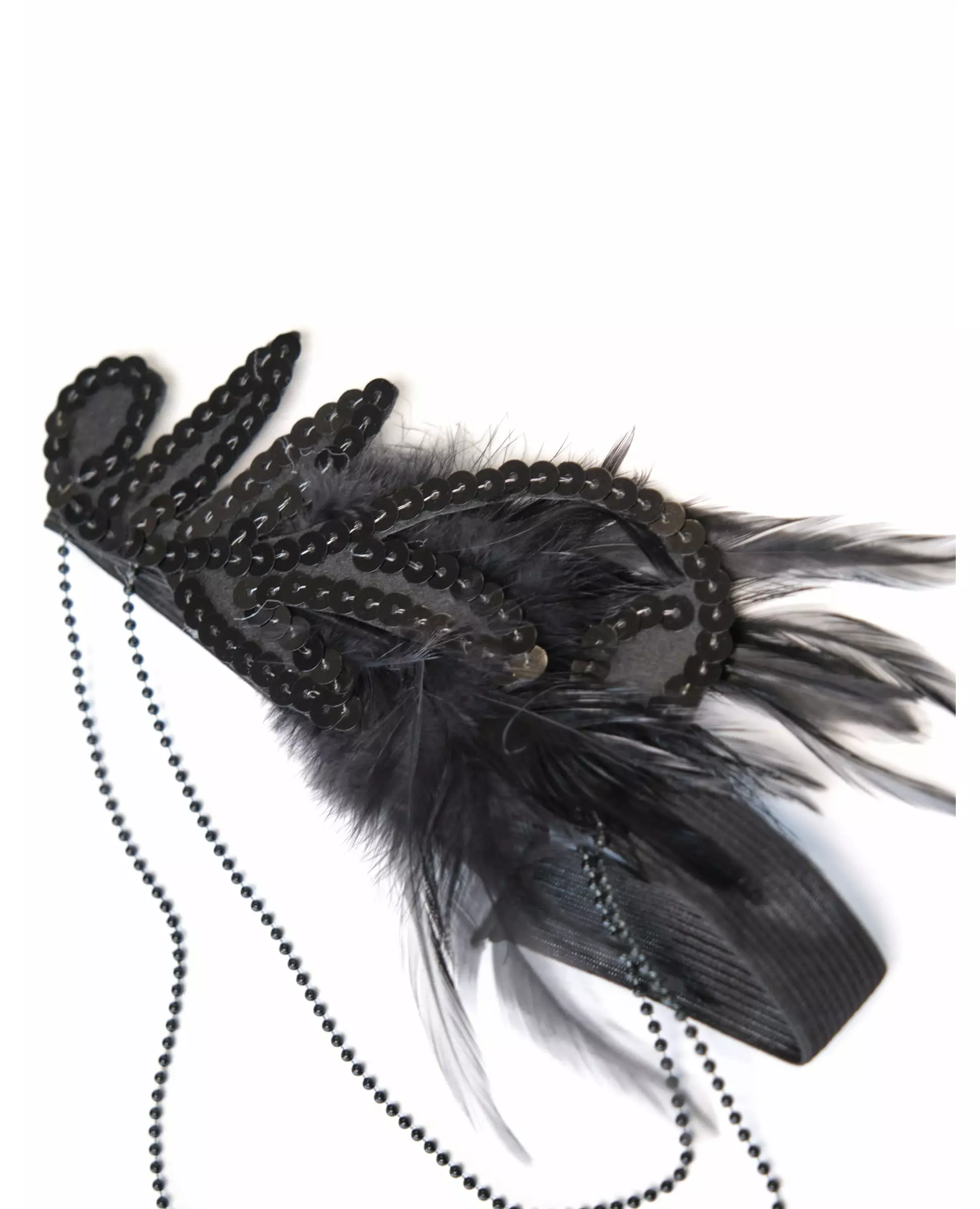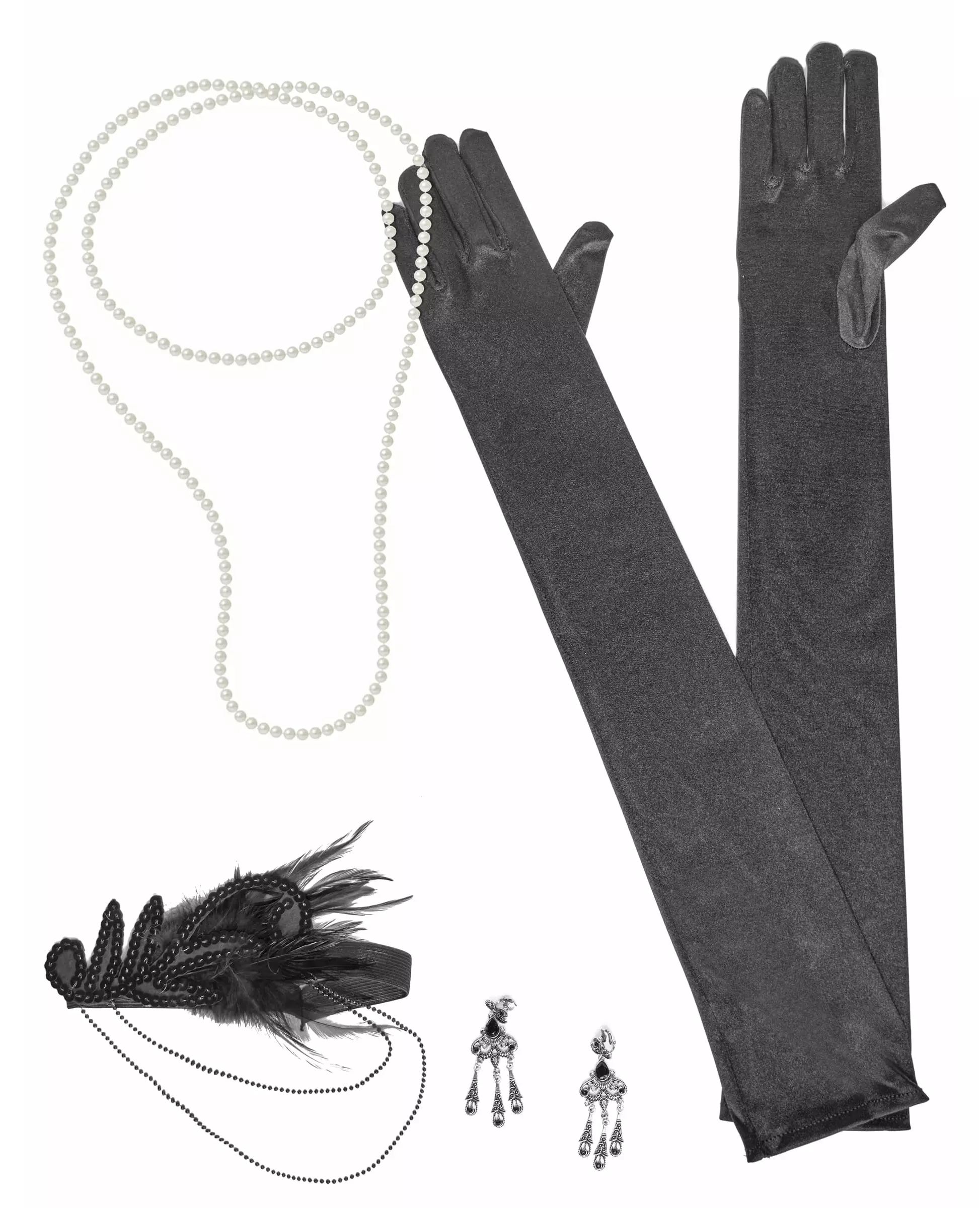 chic Charleston kit! This 20s accessory kit is for women and consists of a necklace, a cigarette holder, a headband, a pair of gloves, and a pair of earrings. The headband is black and is adorned with feathers and sequins. It is also decorated with black beads falling down the side of the face. The gloves are long and black. They have a satin effect, which gives them a chic look. The earrings are silver and black. They are dangling and adorned with faux black stones. The kit is completed by a black and white cigarette holder and a necklace adorned with white pearls. This 20s accessories kit will be perfect to complete your Charleston outfit for New Year's Eve!. Accessories included: 2 Earrings Necklace Cigarette holder Long gloves Headband