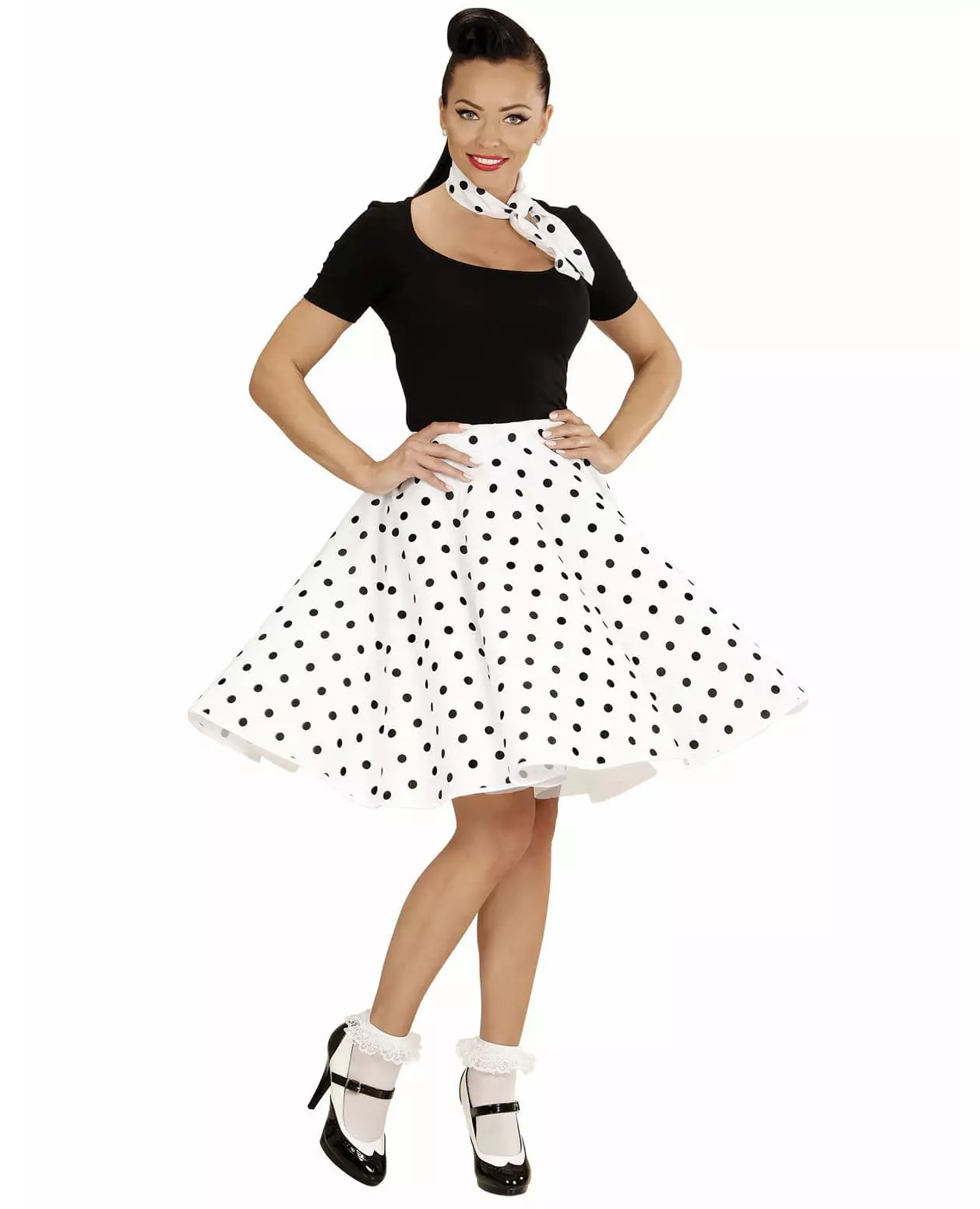 Take a trip back to the Roaring Twenties! This 50s costume for women consists of a skirt and a scarf (t-shirt, socks, and shoes not included). The mid-length skirt is white with black polka dots. Its flared cut is very representative of the outfits of the 50s and 60s. At the waist, 3 large black buttons are sewn on, allowing you to adjust this outfit to your body shape. A scarf cut from the same fabric as the skirt completes this costume. Step into the shoes of a 50s high school girl and heat up the dance floor at a Rock n' Roll party with your friends! © Copyright Widmann SRL. Accessories included: Skirt Scarf Material: 100% Polyester