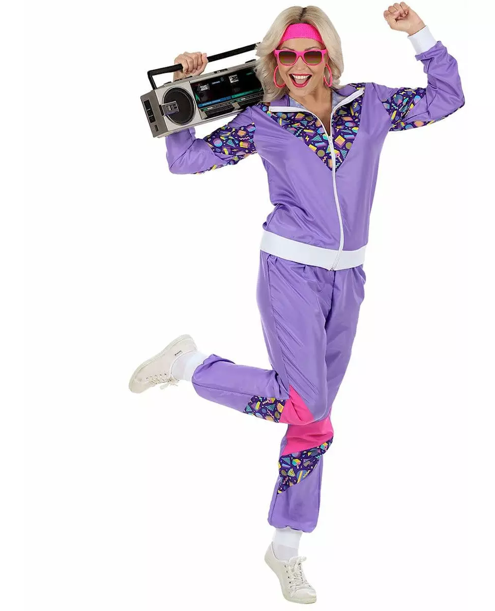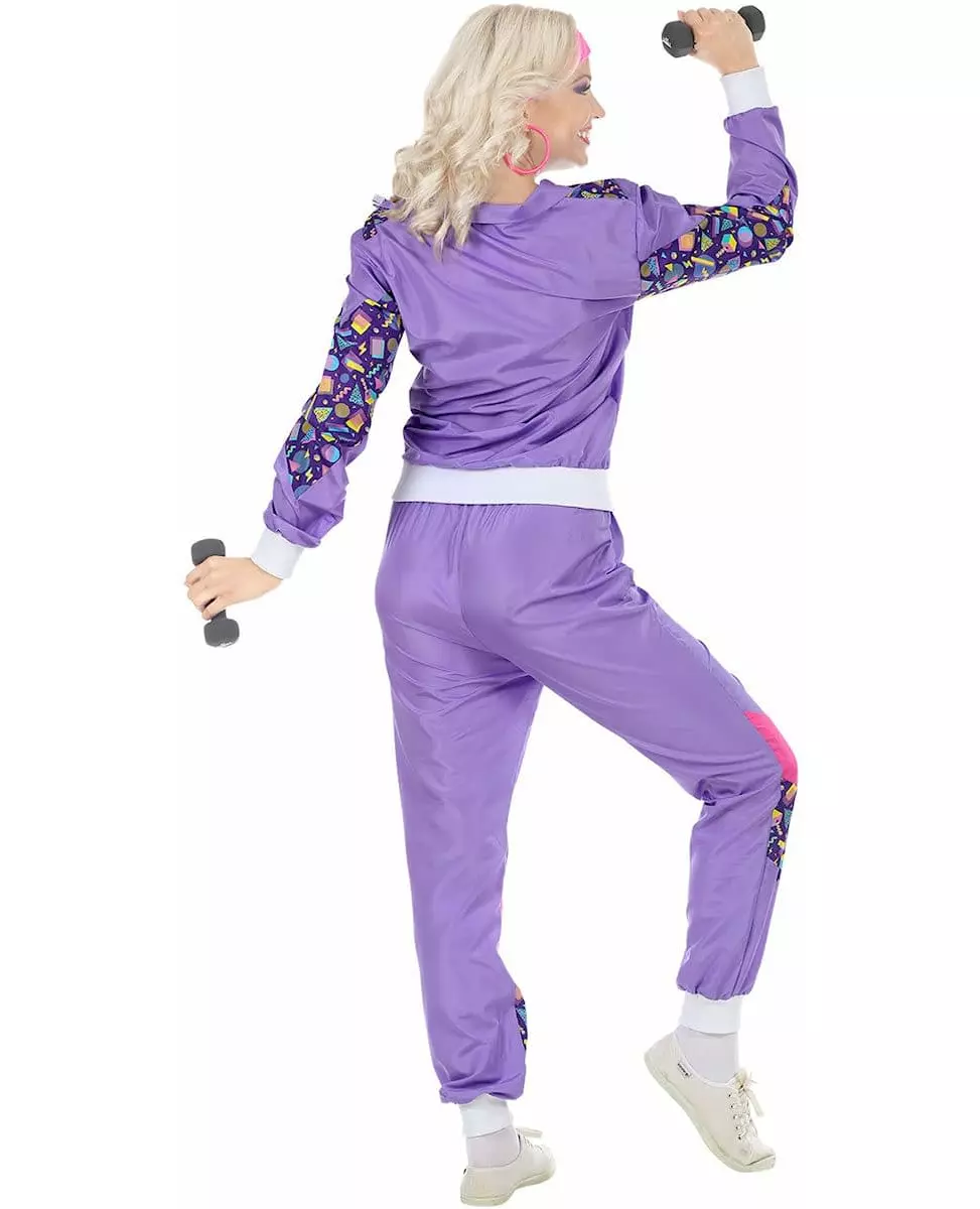Live the 80s with this colorful tracksuit! This 80s costume for women consists of a jacket and pants (headband, earrings, radio and shoes not included). The tracksuit jacket is purple, with dark purple patterned inserts. It closes with a zip on the front. The bottom of the jacket and sleeves are bordered by a wide white band of fabric. The matching pants are purple, with a patterned band of fabric at the knees, and a pink band of fabric. They are tightened at the ankles. This retro costume will be perfect for attending an 80s party. Accessories included: Jacket Pants Material: 100% Polyester Care: Hand wash