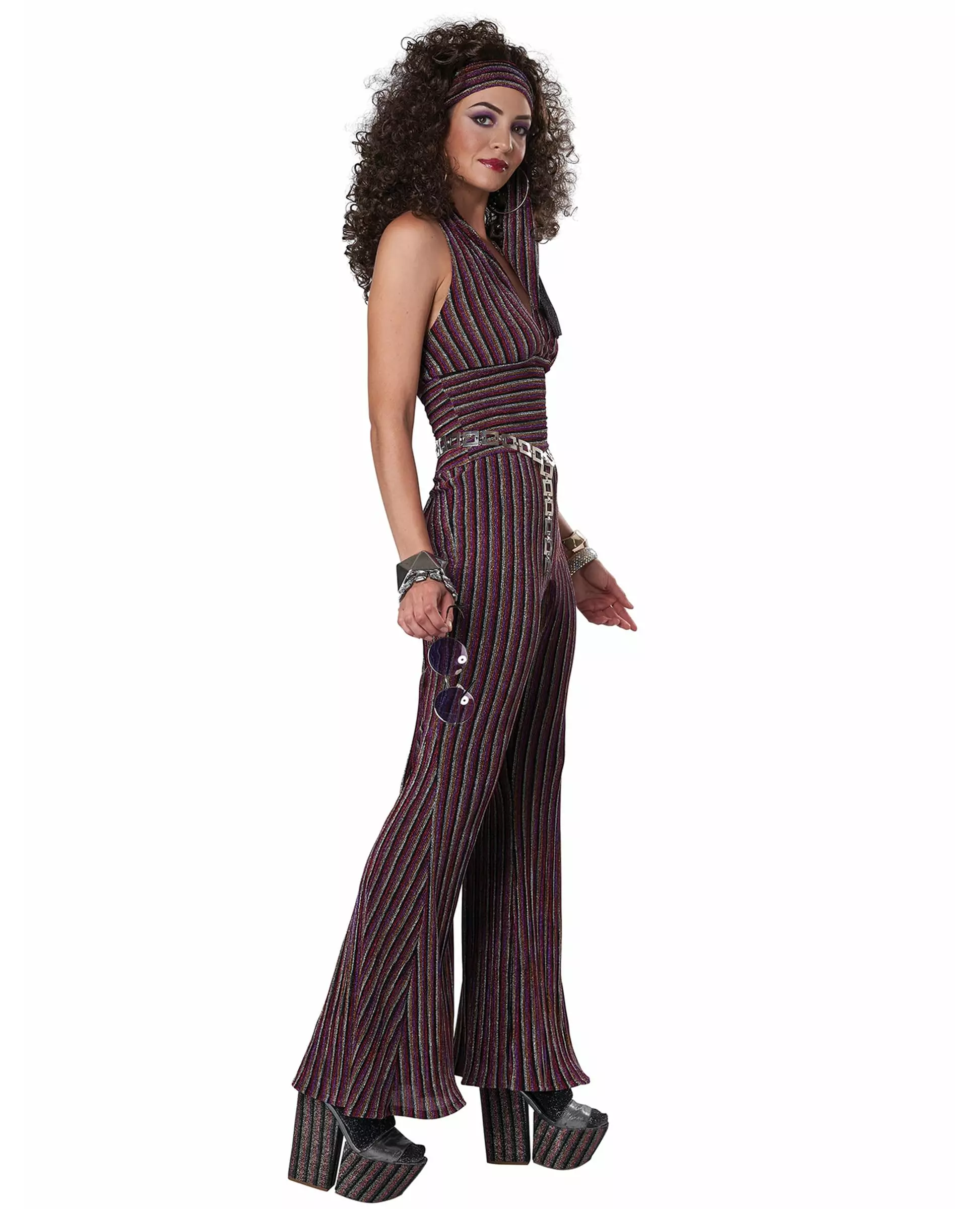 What are you doing Saturday night? Go to your disco party! This backless disco costume is for women. It consists of a top, pants, and a headband. Entirely purple with fine stripes, the costume takes up the codes of the disco era. The pants have flared leg ends while the top allows for a cinched waist thanks to its material. The back is revealed thanks to the way the ties are tied at the neck. The headband, meanwhile It has the same stripes and color as the costume. Travel back in time and go straight to the 70s with this disco costume for your disco-themed costume party! Accessories included: Top Pants Headband Material: Polyester Care: Hand wash