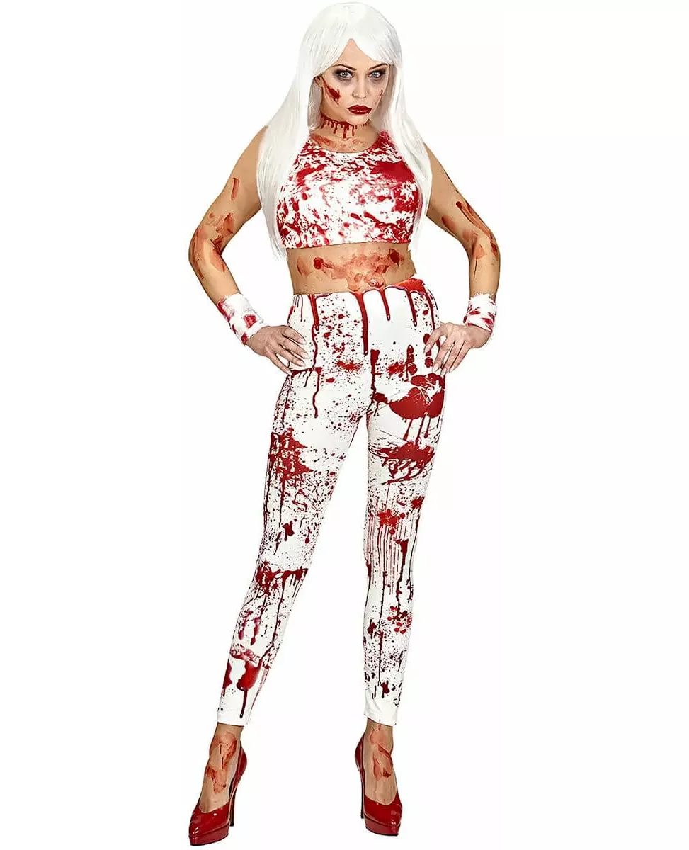 Bloody leggings for your party! These bloody leggings are for women. They are white with blood stains including hand patterns and flowing blood. These leggings include these patterns on the front and back. These leggings will be perfect to complete your bloody Halloween costume. Accessories included: 1 pair of leggings Material: 100% polyester Care: Hand wash