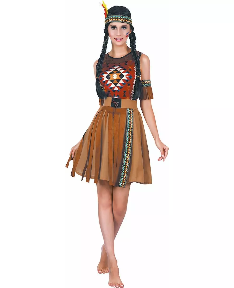 Aztec or Quechua? This Native American costume for women includes a dress, a belt, a headband, and a pair of armbands. The bust of this dress is orange with ethnic geometric patterns. The bottom of the dress is made of brown imitation suede with fringes and a strip of fabric with ethnic patterns. A belt will cinch the dress at the waist, and a pair of fringed armbands matching the bottom of the dress accessorizes this complete Native American costume. Finally, a feather headband matching the armbands and the bottom of the dress completes the accessorization of this costume. This Indian costume will be ideal for playing a beautiful Indian at a carnival or a western-themed party. Accessories included: Dress Belt Headband Armbands Material: Polyester Care: Hand wash