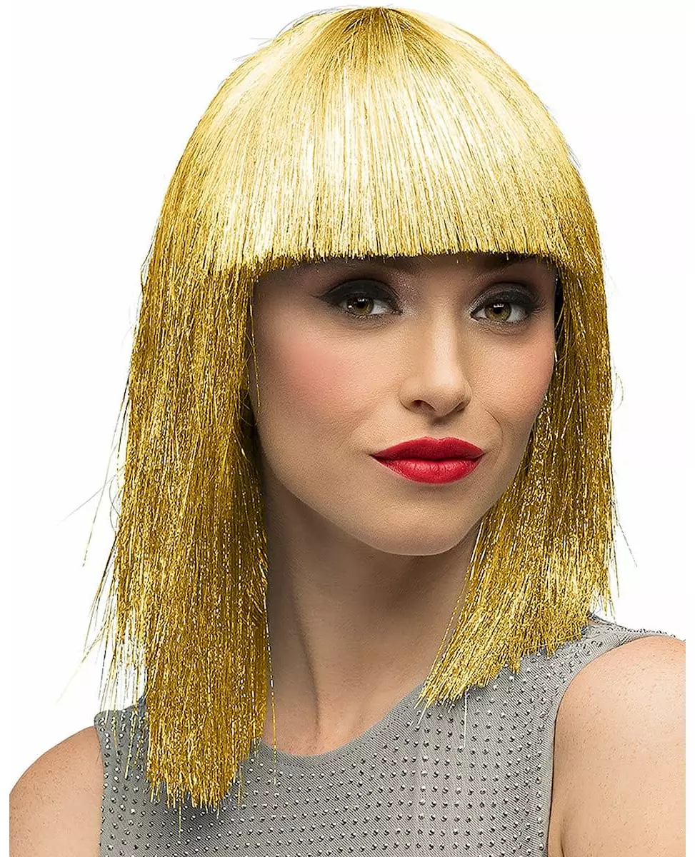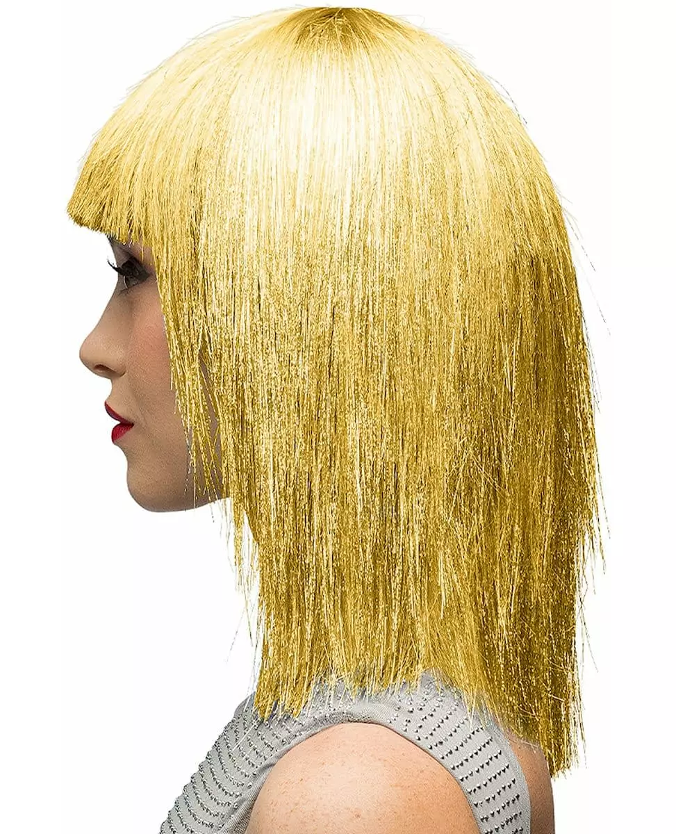 Radiate glamour! This iridescent gold wig for women is the ideal accessory to enhance your look with sparkle. Its hair in gold metallic thread diffuses luminous reflections with every step. Its straight cut decorated with a clean fringe frames the face and brings a bold and spectacular style. A must-have for your disco-themed party outfits, show girl or queen of the evening. Perfect for Carnival, a 70s party or a glittering event, this wig promises to put you in the spotlight. Accessories included: 1 Wig Material: Synthetic