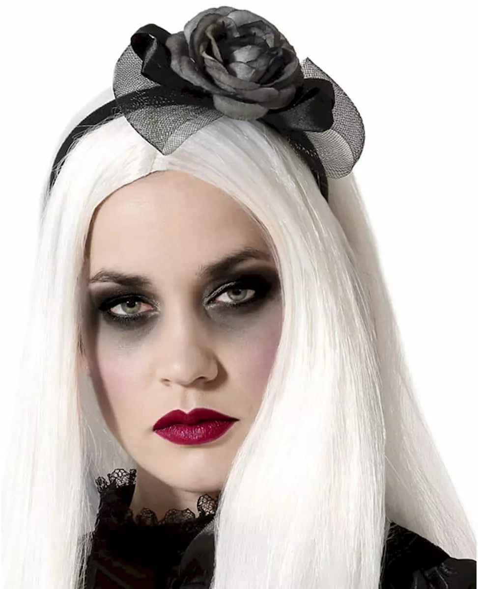 For Halloween, think about accessories to complete your outfit This black headband is for adults. It is topped with a gray fabric rose. This rose is accompanied by black ribbons and veils. This accessory will be perfect to complete a black widow costume on Halloween night. Accessories included: Headband Material: Plastic