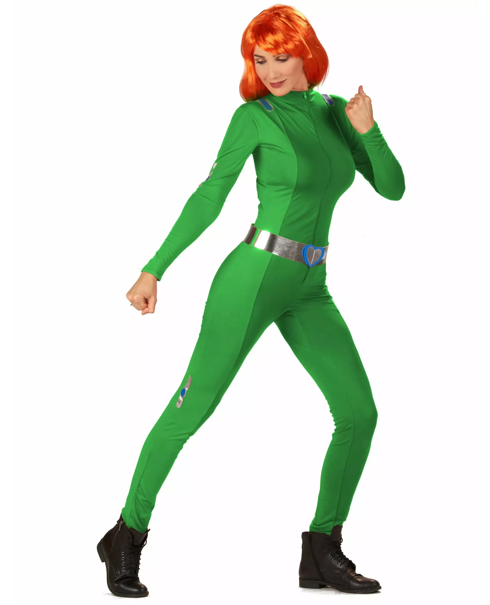 Become your favorite cartoon heroine This green spy costume for women consists of a jumpsuit and a belt. The elastic jumpsuit is green, with a darker stripe in the center. It is decorated with silver and blue details on the shoulders, elbows, and knees. This jumpsuit closes at the front with a zip. The belt is silver with a heart in the center. It closes with Velcro. This costume will be perfect for transforming into a spy for the Carnival.. Accessories included: Jumpsuit Belt Material: 100% Polyester Care: Hand wash Measurement information: For size S the jumpsuit measures approximately 145 cm in length. For size M, the jumpsuit measures approximately 147 cm in length.