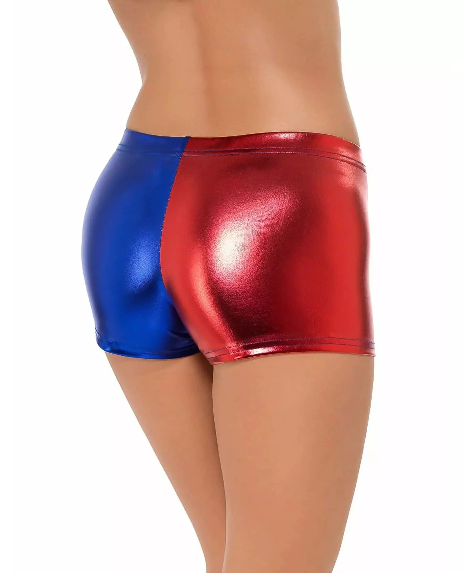 Complete your harlequin costume with these two-tone shorts. These harlequin mini shorts are for women. They are made of a very elastic shiny fabric. One side of the shorts is blue, and the other is red. These shorts measure approximately 27 cm in length. They have an elastic waistband for added comfort. These shorts will be perfect to complete a harlequin costume and thus embody the dangerous and sexy Harley Quinn for Halloween. Accessories included: Shorts Material: 85% Polyester, 15% Spandex Care: Hand wash