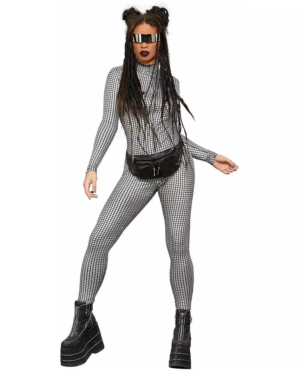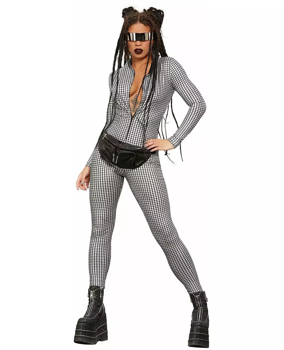 The future is near! This holographic disco jumpsuit is for women. It includes only a zip-up jumpsuit. The long-sleeved jumpsuit, black and gray, is characterized by its grid appearance throughout. The closure is located on the central part, with a zip. Dare to wear this original and fun costume during your costume party with friends! Accessories included: 1 Zip-up jumpsuit Material: 100% Polyester Care: Hand wash