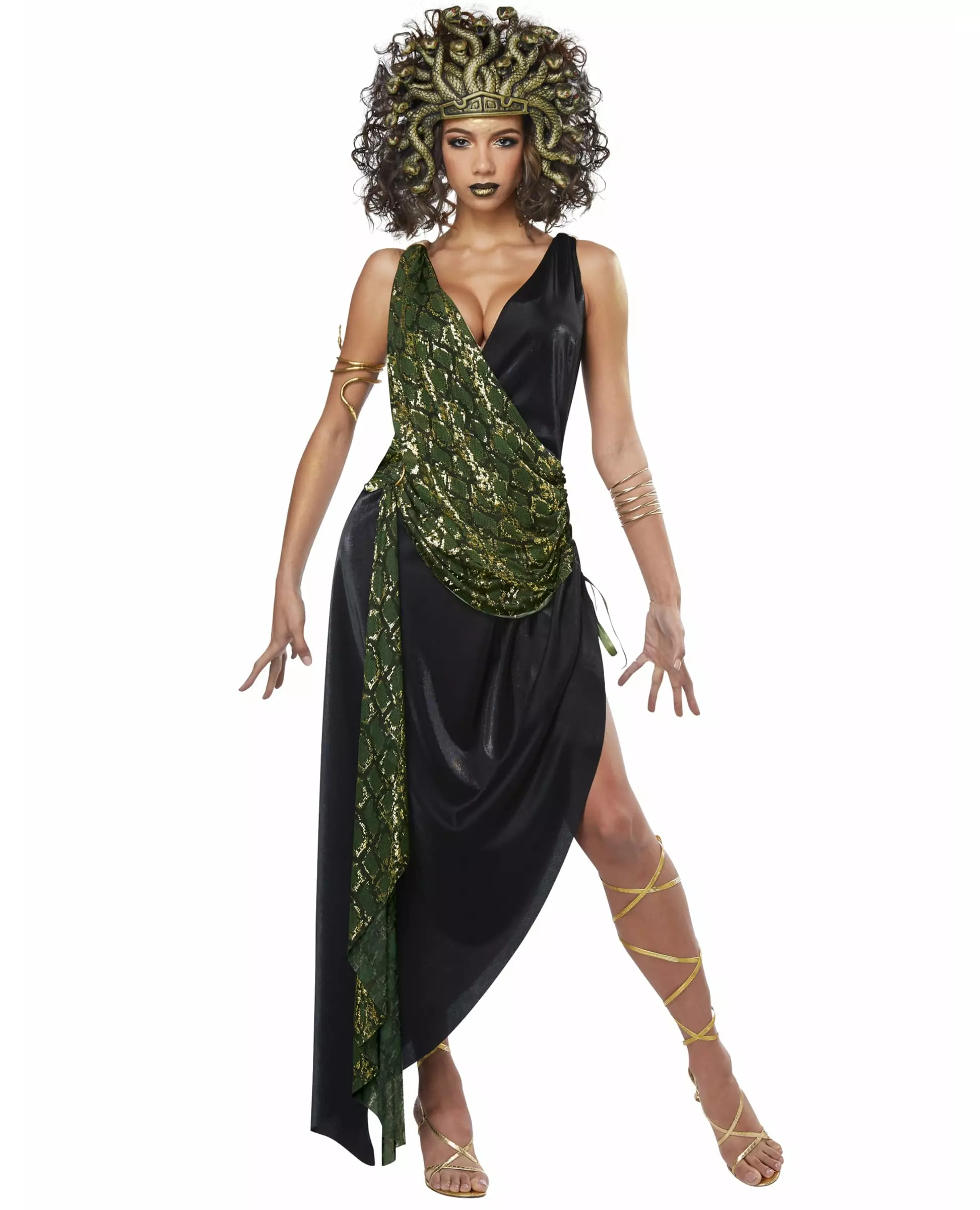 Put yourself in the spotlight in this magnificent Medusa costume. This Medusa costume for women contains a dress and a headpiece. (Bracelets and shoes not included). This sumptuous black dress with a plunging neckline includes an asymmetrical side, one of which reaches mid-thigh and goes down to the feet on the other side. The upper part of the costume is also khaki green with sequins. The headpiece decorated with many small snakes will give that little extra touch. This Medusa costume will be perfect for a Greek mythology themed party. Accessories included: Dress Helmet Material: 100% polyester Care: Hand wash