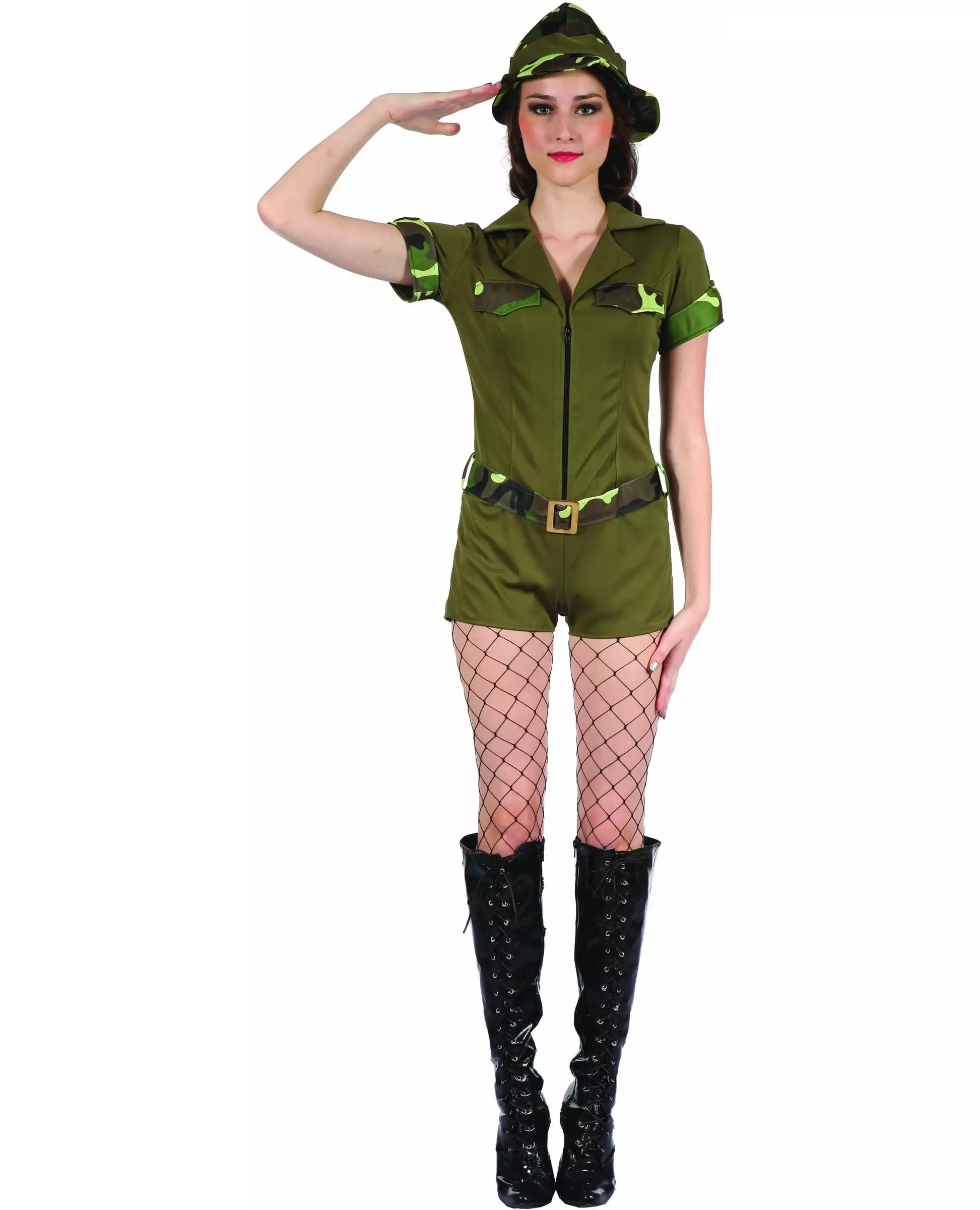 Go into battle well prepared in this military costume. This military costume for women consists of a jumpsuit, a belt, and a hat. The very short jumpsuit is khaki green. The sleeve cuffs and fake pockets have a camouflage print. Belt loops are present at the waist for easy belt passage. This jumpsuit will close with a zipper at the front. A belt will highlight your waist. This one matches the fake pockets with its camouflage print. It has a gold plastic buckle but will tie in the back. A hat adds the finishing touch to this costume. Made of foam, it has a camouflage print and a khaki headband at its base. This costume will be perfect for playing a sexy military woman at Carnival or a costume party. Accessories included: Jumpsuit Belt Hat Material: 100% Polyester Care: Hand wash